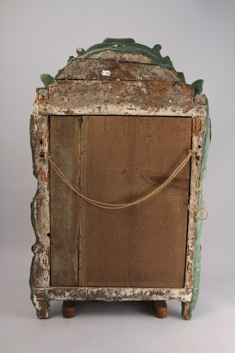 MIROIR de forme rectangulaire en bois sculpté, stuqué, laqué vert et doré. Le fronton orné d'un vase fleuri dans un cartouche orné d'une coquille, flanqué de feuilles d'acanthes. Le pourtour du miroir orné de S à volutes.
