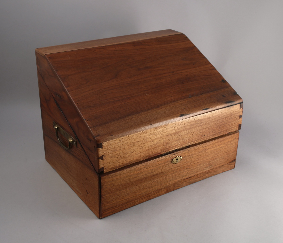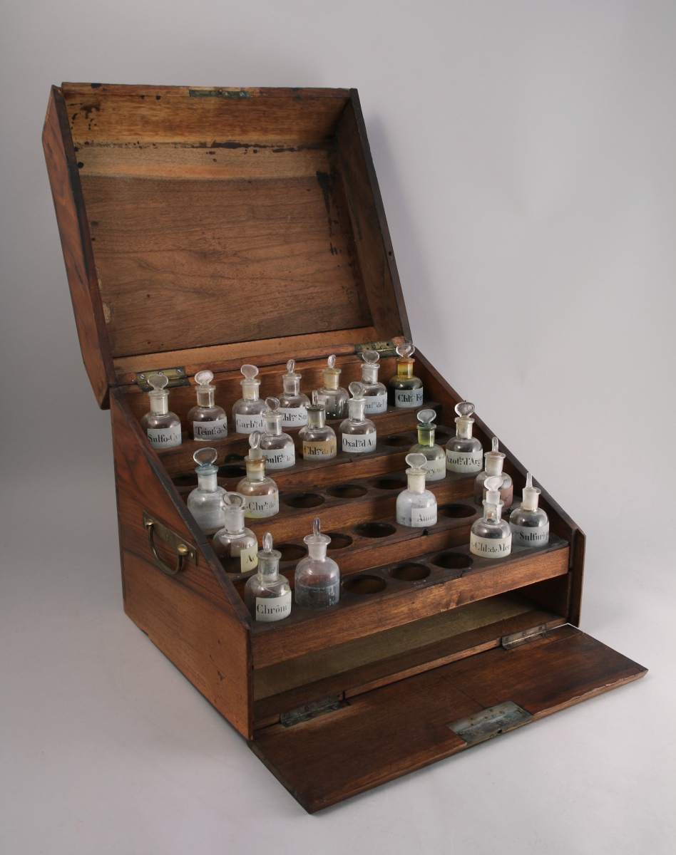 COFFRET de CHIMISTE de forme trapézoïdale en noyer et poignées de laiton. Le couvercle découvrant un intérieur compartimenté à gradins et vingt-un flacons en verre. Il ouvre sur le côté droit à un tiroir à système, découvrant de la verrerie de chimie.