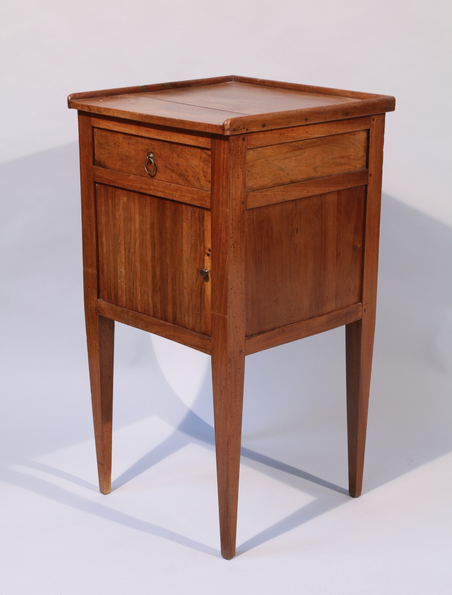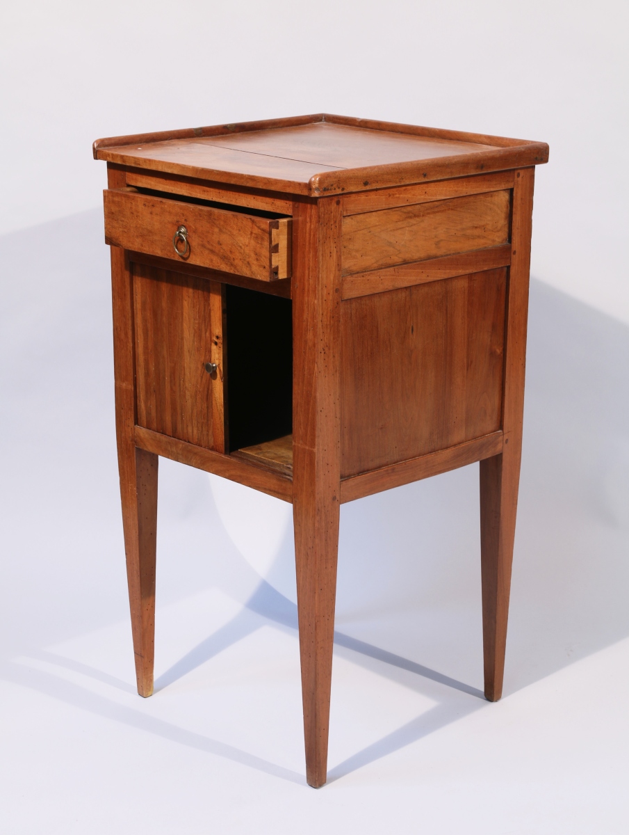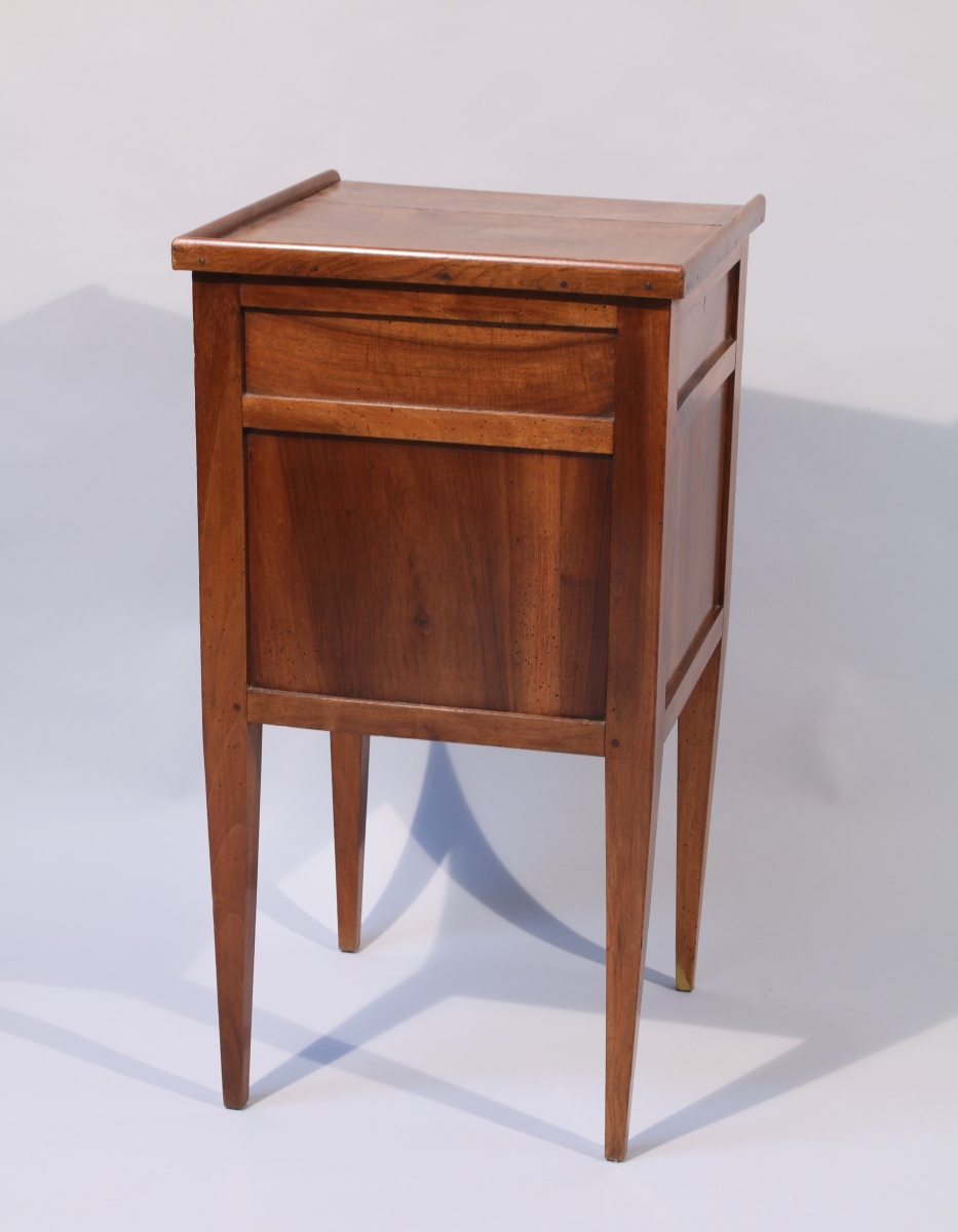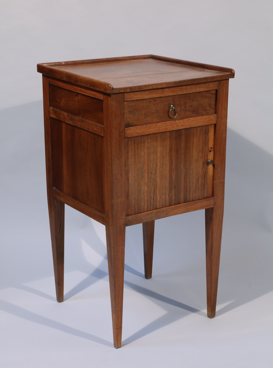 CHEVET de forme carrée en noyer, ouvrant en façade par un tiroir et un volet à lattes, repose sur quatre pieds gaine.