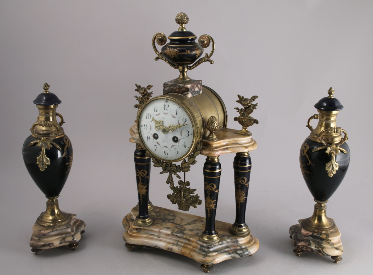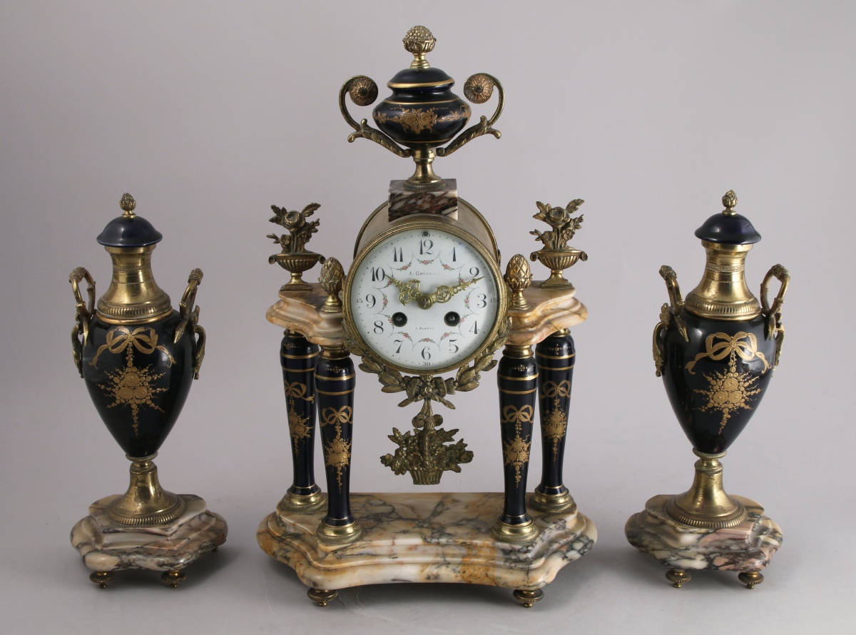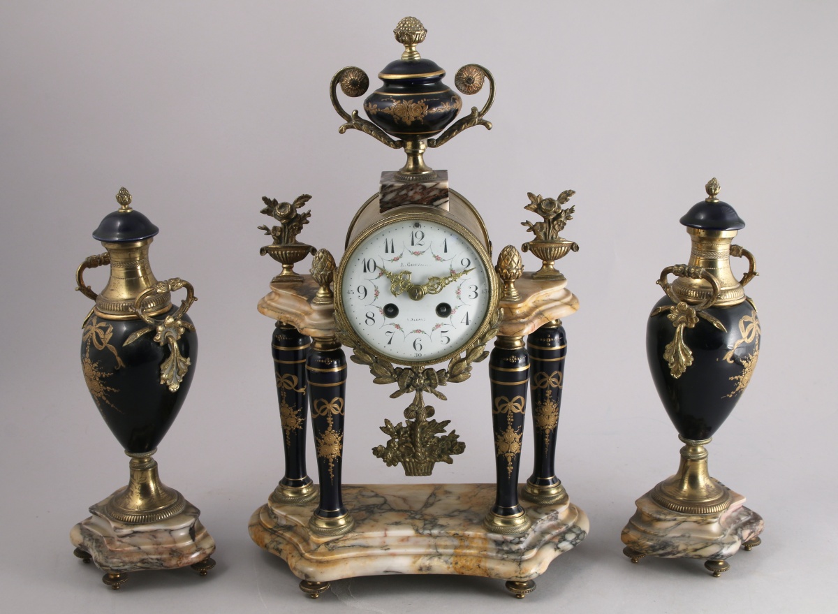 GARNITURE de CHEMINÉE en porcelaine émaillée bleu nuit à décor or et bronzes dorés. Elle se compose d'une pendule portique reposant sur quatre colonnes et de deux vases balustre. Bases en marbre de forme chantournée. Cadran signé A. CHEVA... (?) / ORLÉANS.