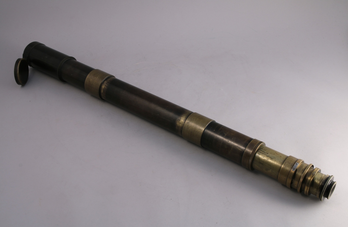 LUNETTE de SIEGE en bronze à deux tirages, marquée "Lunette de siège à grossissement variable n°24 Puteaux 1910". La lentille externe à obturateur à charnière. Dans sa boîte en bois d'origine.