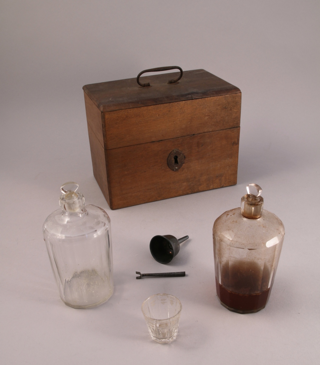 COFFRET à parfum en bois naturel. Paire de flacons en verre, petit verre à pans coupés, entonnoir argenté. Seconde moitié du XIXè.