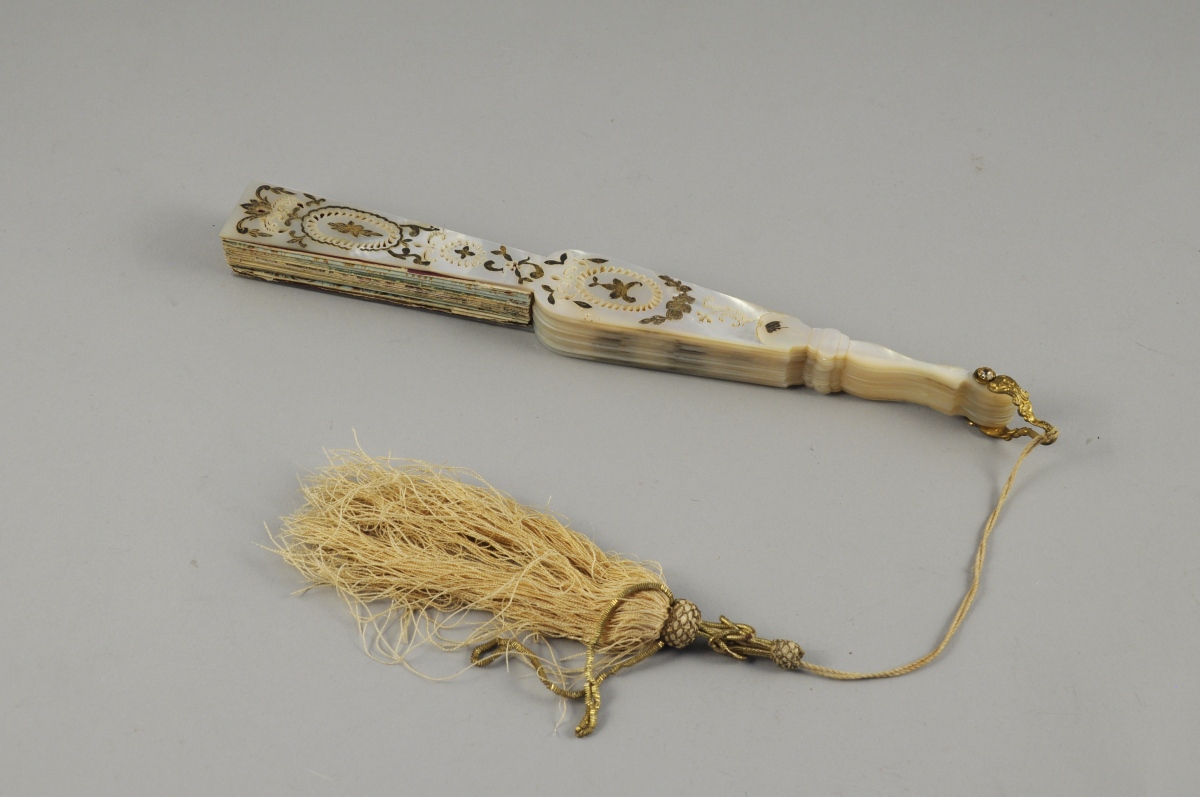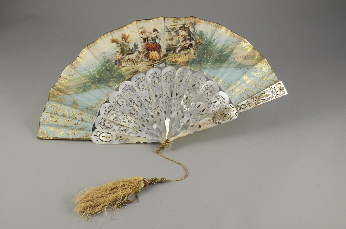 ÉVENTAIL plié. La feuille en papier lithographié et rehaussé à la gouache d'une scène galante dans un entourage de fleurs et de rinceaux polychrome et or. Une scène pastorale animée de deux bergères et d'un berger devant un château au revers. Monture en nacre ajourée de cartouches et rinceaux or. Bélière et gland.