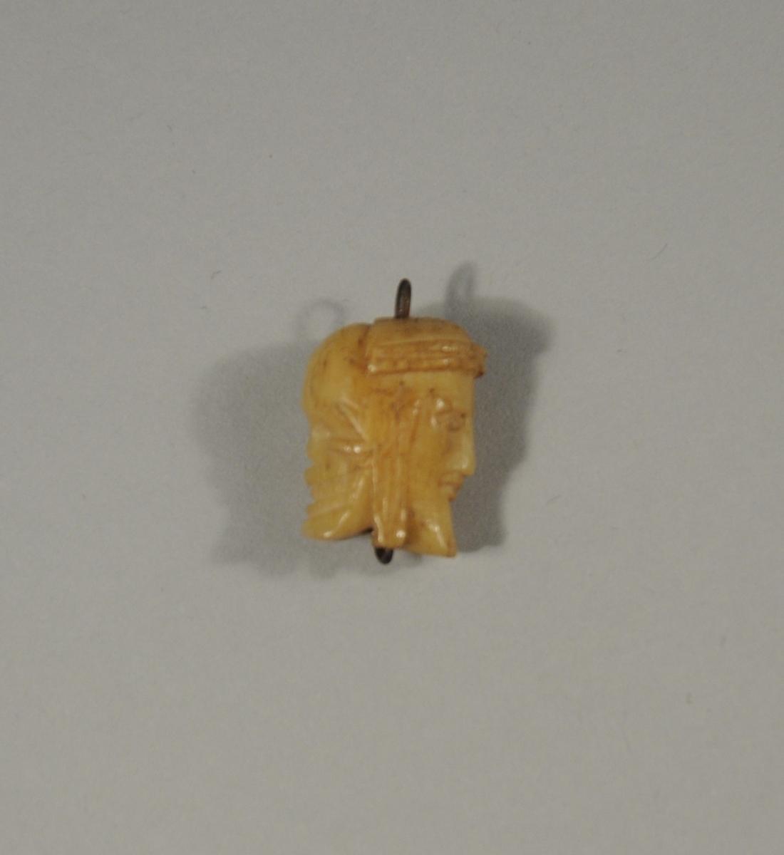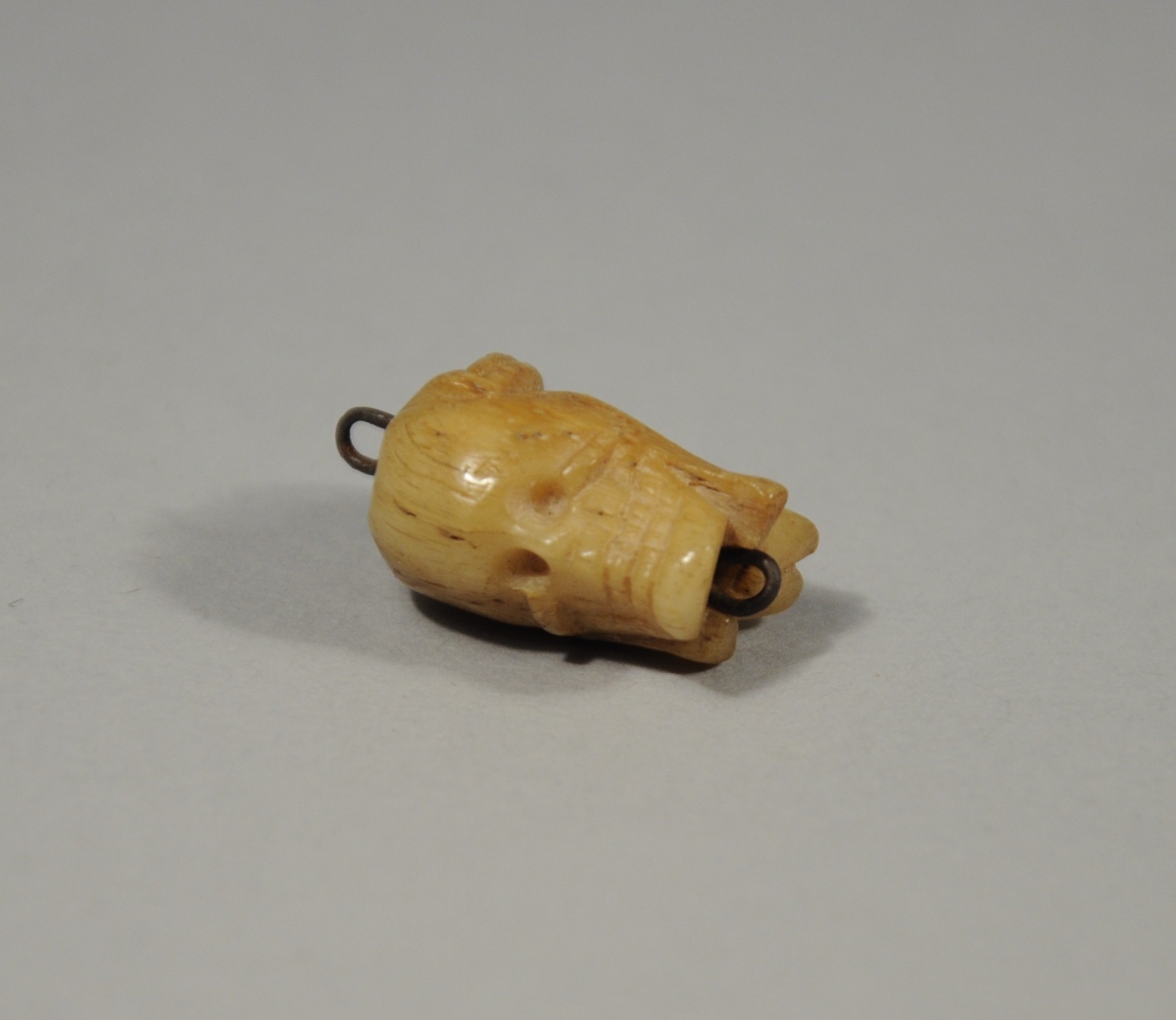 GRAIN TERMINAL DE CHAPELET MEMENTO MORI en os sculpté d'une part de la tête du Christ et d'autre part d'un crâne. Travail ancien.