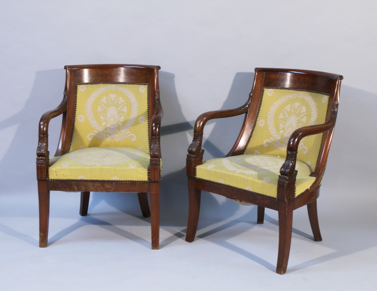 PAIRE de FAUTEUILS à dossier gondole en acajou et placage d'acajou. Accotoirs à tête de dauphin. Reposent sur quatre pieds sabre.