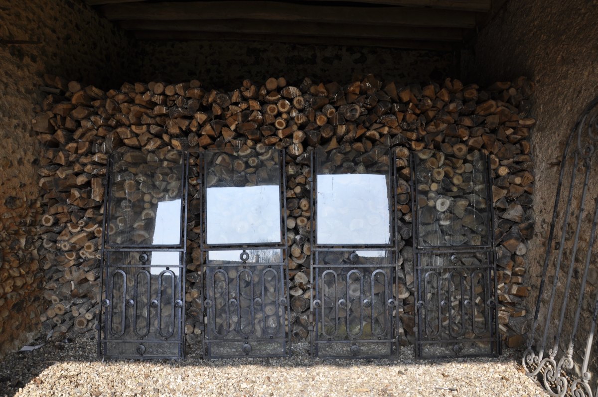 QUATRE PORTES-GRILLES en fer forgé, et panneau de verre. Travail du XXe.