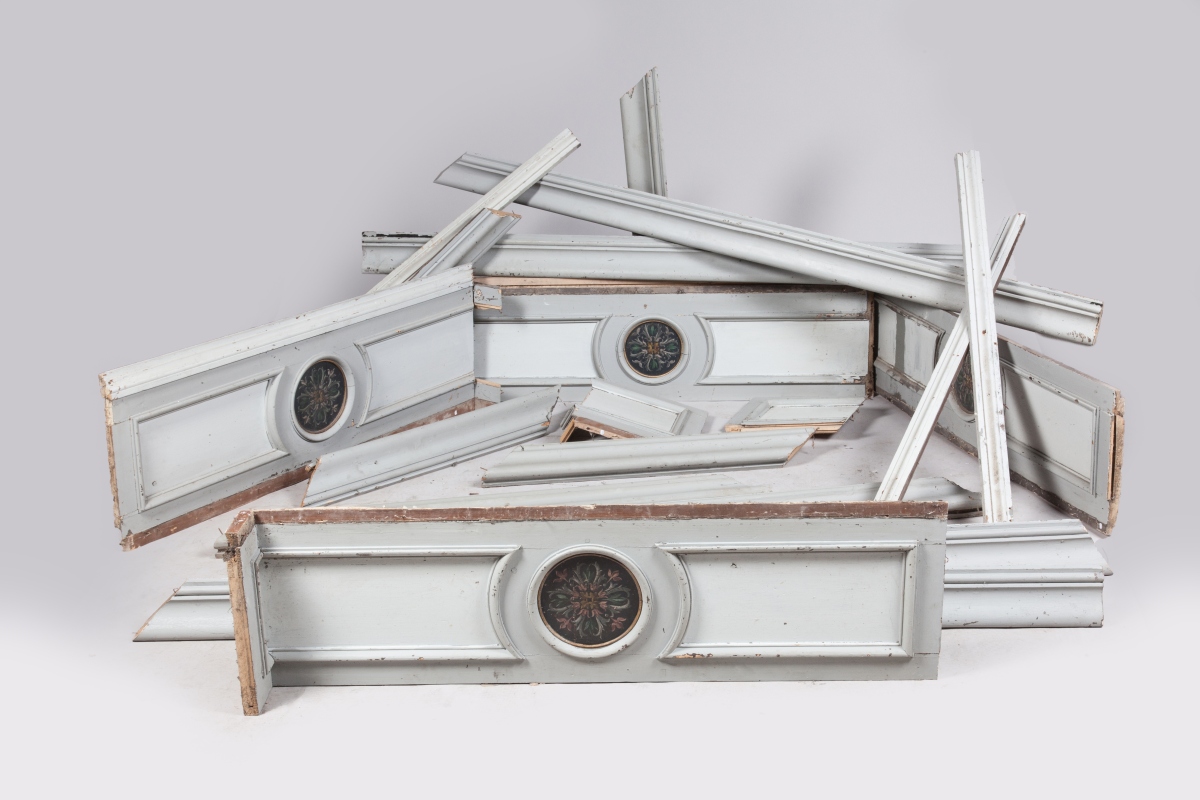 Bois sculpté, mouluré à panneaux et entrelacs. Décor peint.
