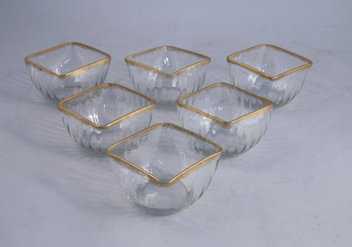 SIX COUPES de forme carrée à côtes torses légèrement godronnées en verre, la lèvre dorée.