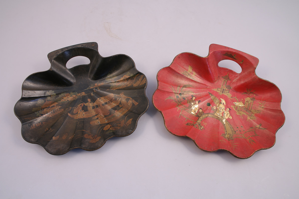 Deux PELLES DE TABLE adoptant la forme d'une coquille en carton bouilli à l'imitation du laque extrême-oriental. L'une à fond rouge à décor or d'un paysage au pont et pagodes animé de personnages. L'autre à fond noir figurant une scène lacustre aimée de personnages en barque.