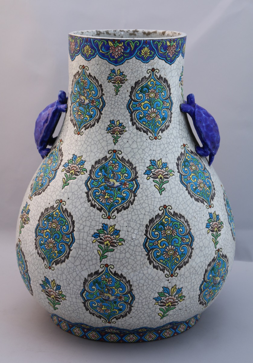 GIEN. Important VASE balustre pansu à décor polychrome dit persan de cartouches feuillagés dans le goût des émaux de Longwy sur fond blanc craquelé. Anses aux tortues émaillées bleu.