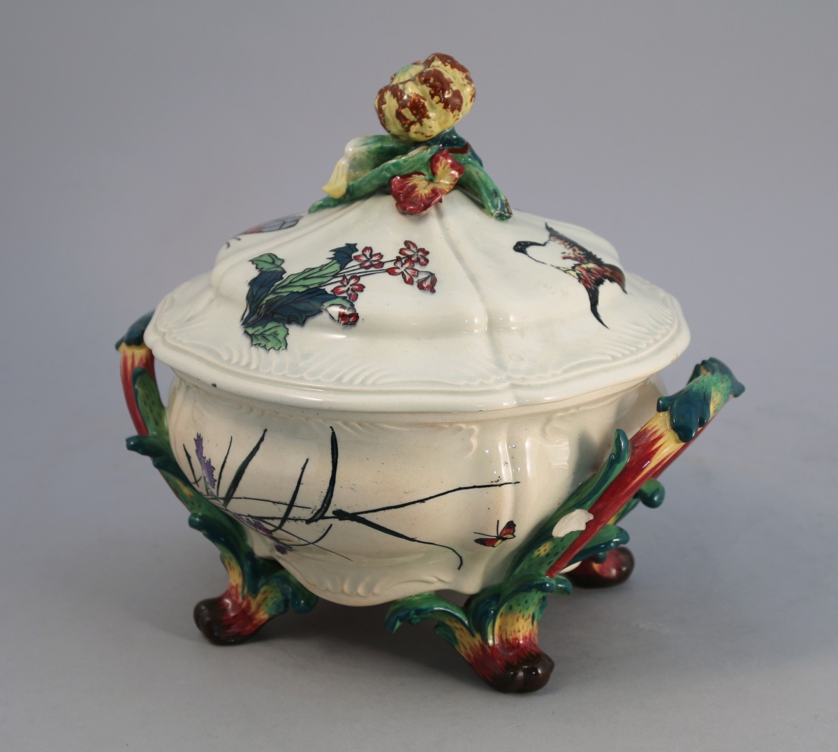 CREIL & MONTEREAU, LM&Cie. Partie de SERVICE dit ROUSSEAU, 49 pièces en faïence fine à crêtes, à décor polychrome japonisant d'après les dessins de Félix Bracquemond. Il se compose de 33 assiettes plates (diam. 25,5 cm), de 12 assiettes creuses, d'un grand plat de service de forme ovale (50 x 37 cm), d'une saucière et son dormant, d'un ravier et d'une soupière (accident). Cachet.