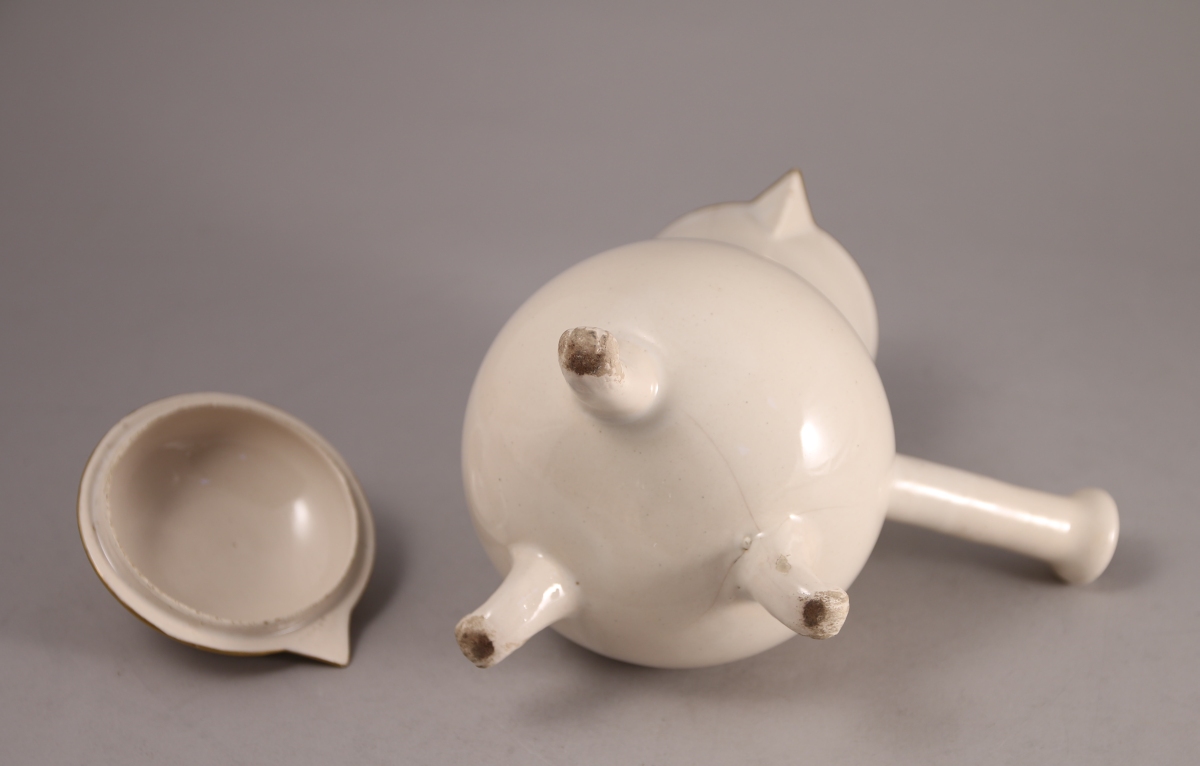 SAINT-CLÉMENT, faïence fine. CHOCOLATIÈRE couverte reposant sur trois pieds. Fond blanc à rehauts or. XIXe.