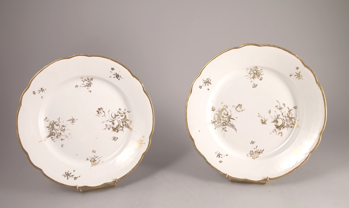 SAINT-CLÉMENT, faïence fine. Paire de PLATS de forme ronde à bords festonnés à fond blanc. Décor en plein de bouquets de fleurs traités en dorure. XVIIIe.