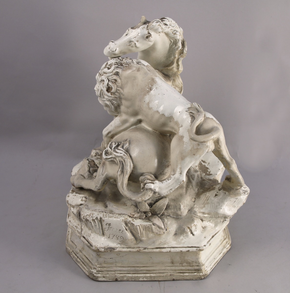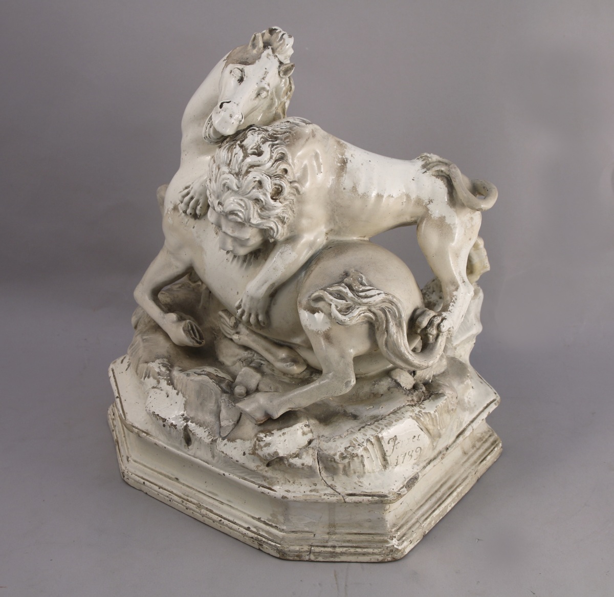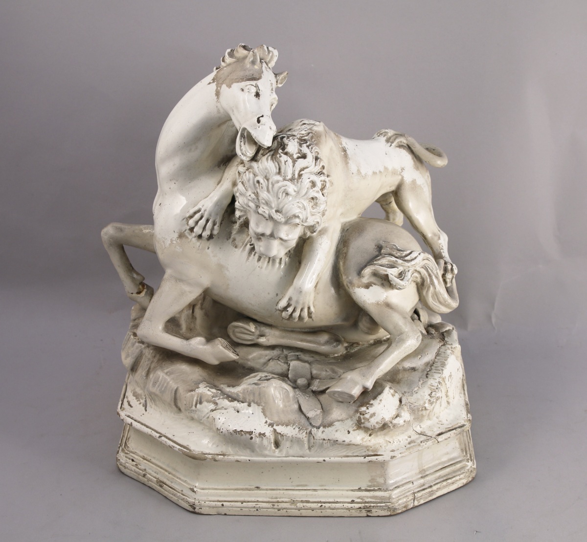 ALCORA. Lion dévorant un cheval. Groupe en faïence émaillée blanc signé Ferrer et daté 1789.