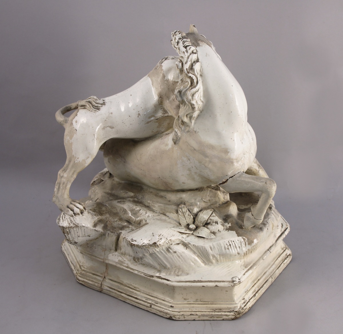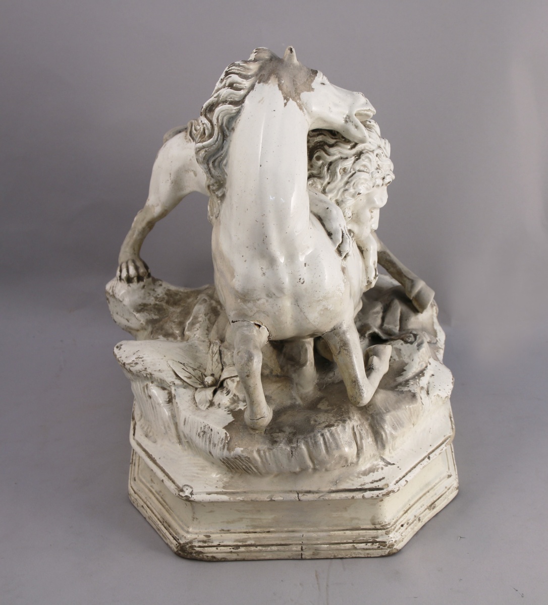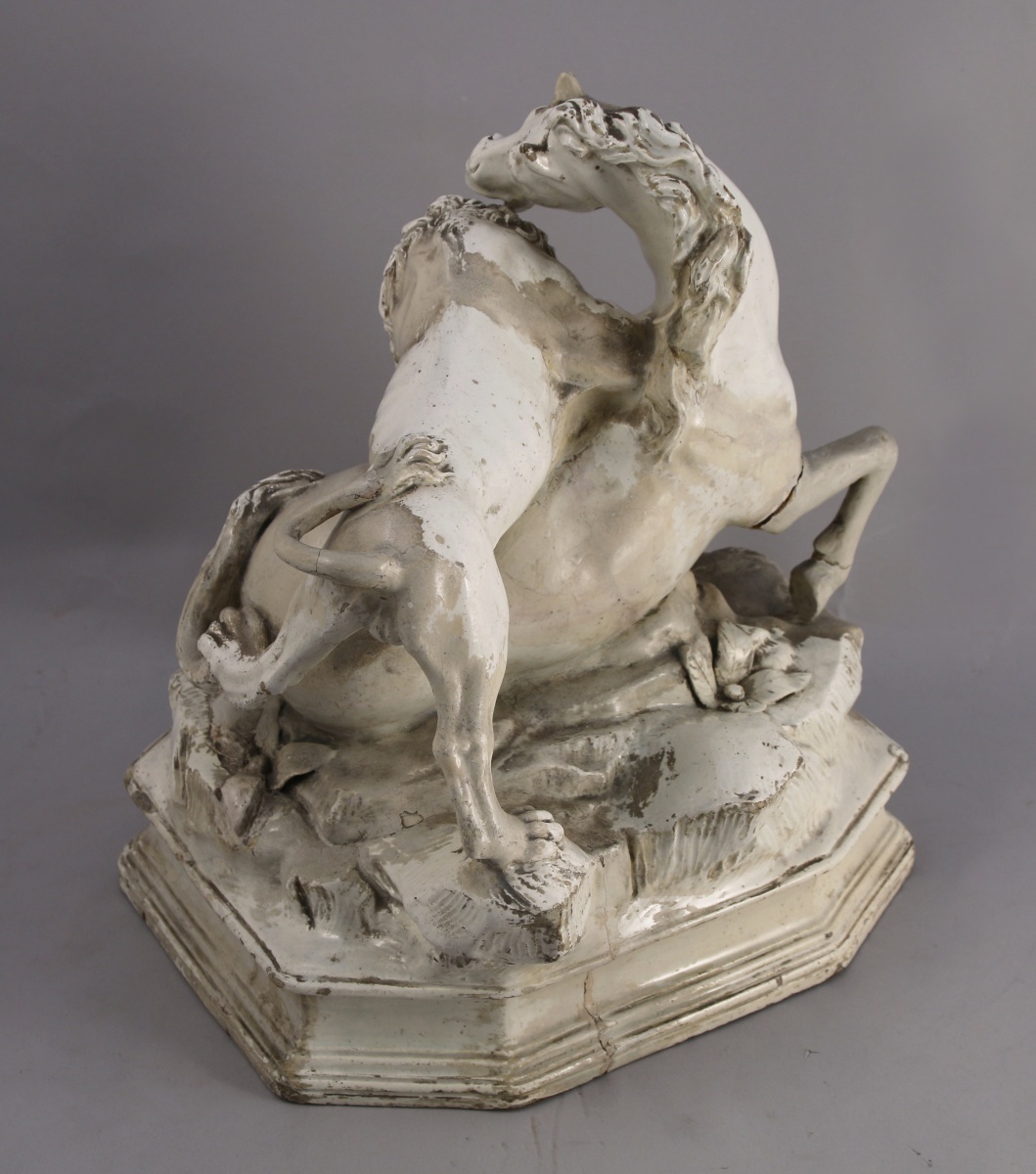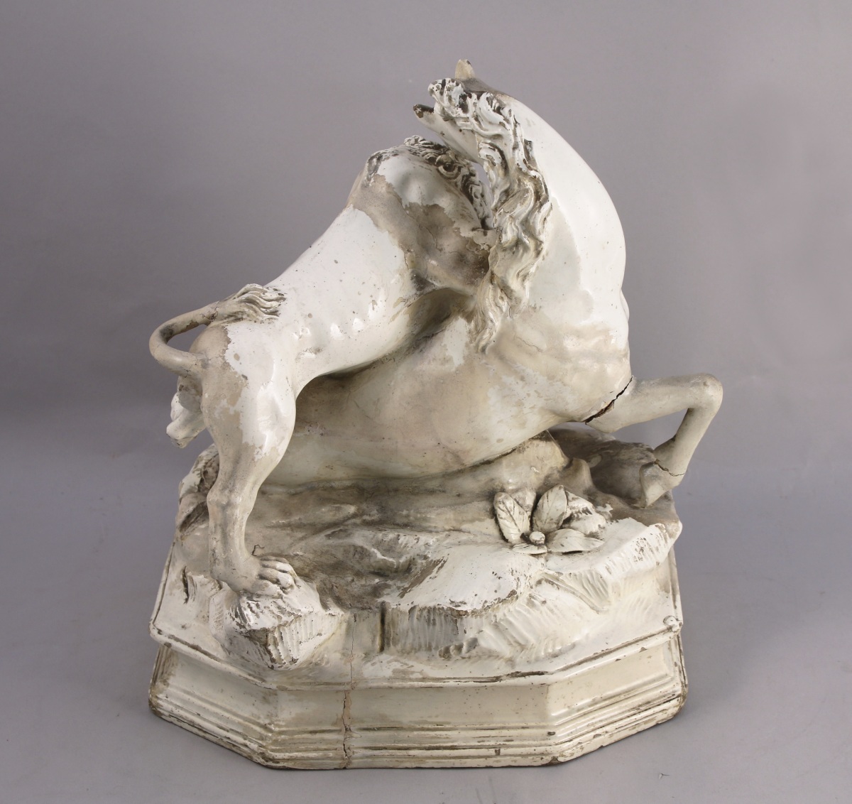 ALCORA. Lion dévorant un cheval. Groupe en faïence émaillée blanc signé Ferrer et daté 1789.
