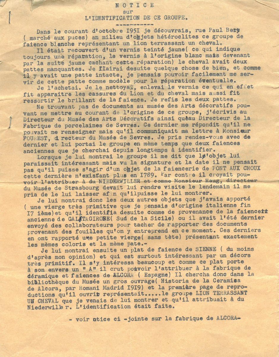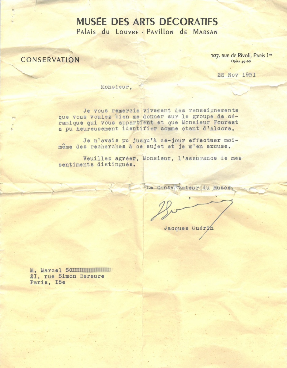 Un courrier de Jacques Guerrin, conservateur du Musée des Arts Décoratifs et une note d'après une entrevue avec Mr Fourest, Directeur du Musée de Sèvres concernant l'identification de ce groupe en 1951 sont jointes.