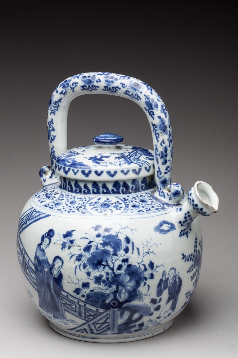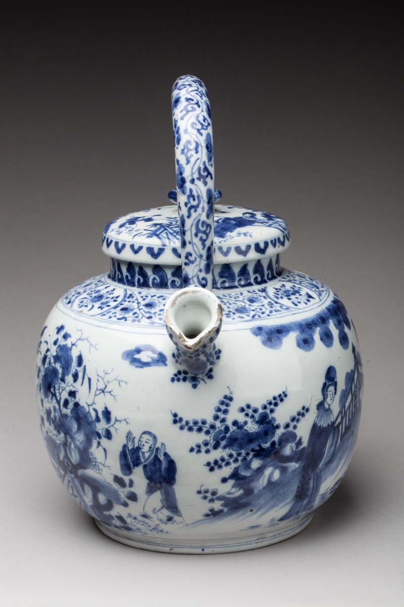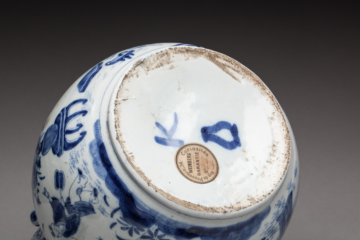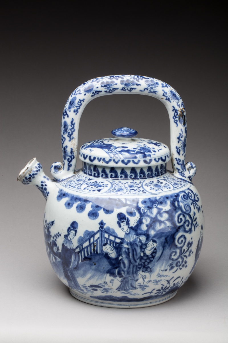 DELFT (?). THÉIÈRE à anse fixe en faïence, le décor à l'imitation de la Chine en camaïeu bleu de personnages dans un jardin. L'anse et l'épaule à décor de fleurs. Marques au revers.
