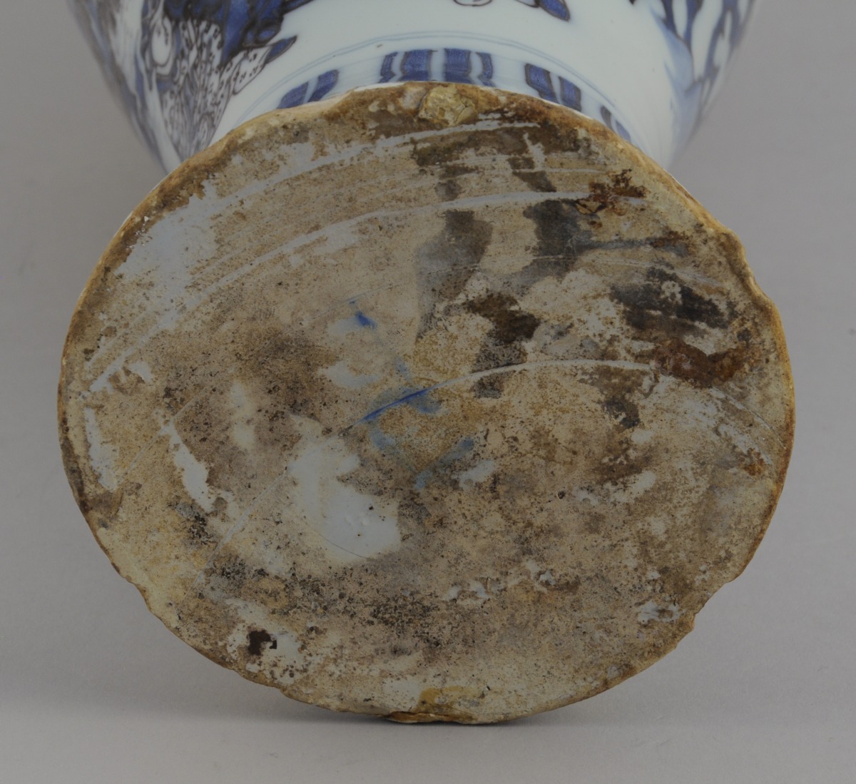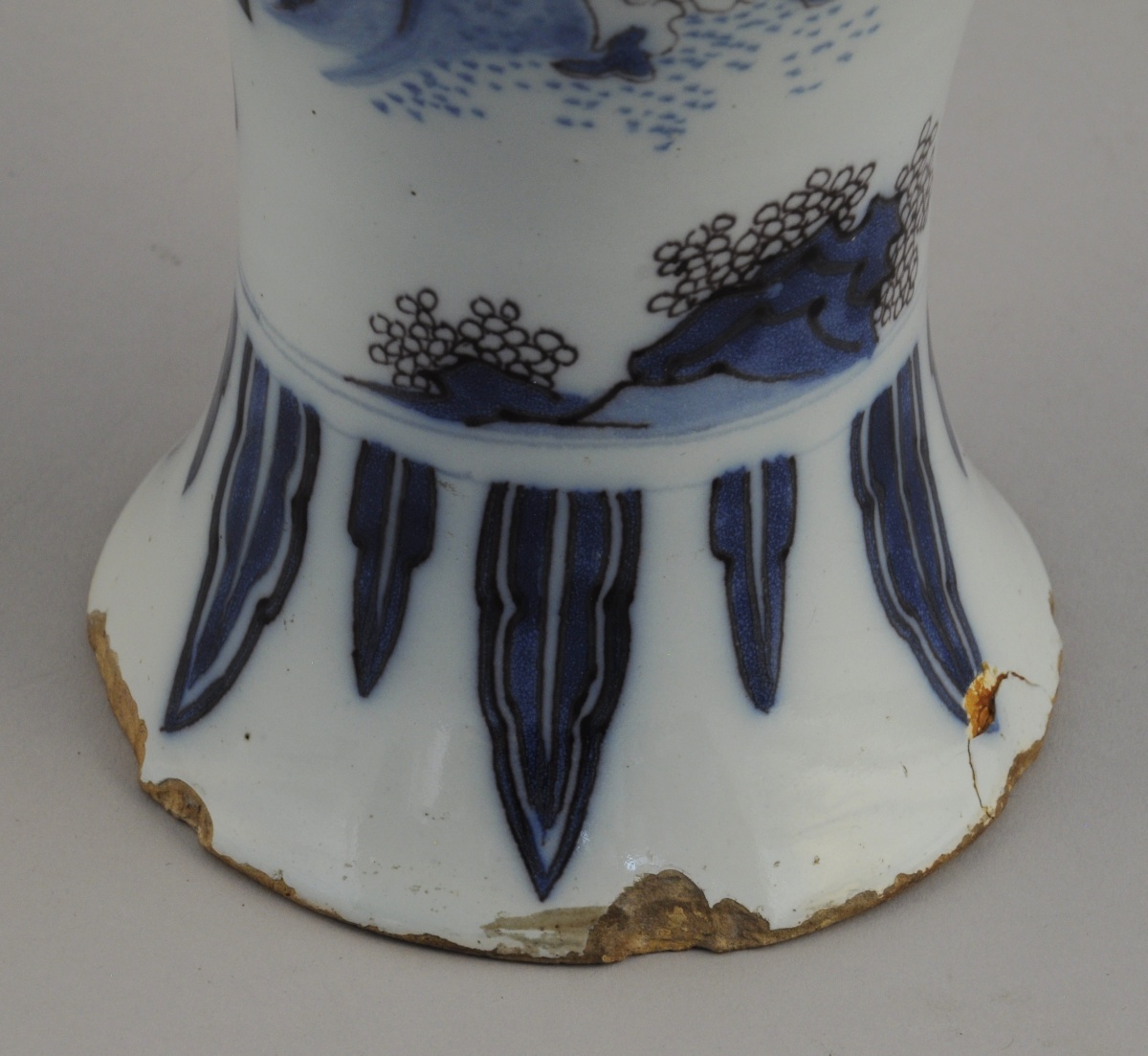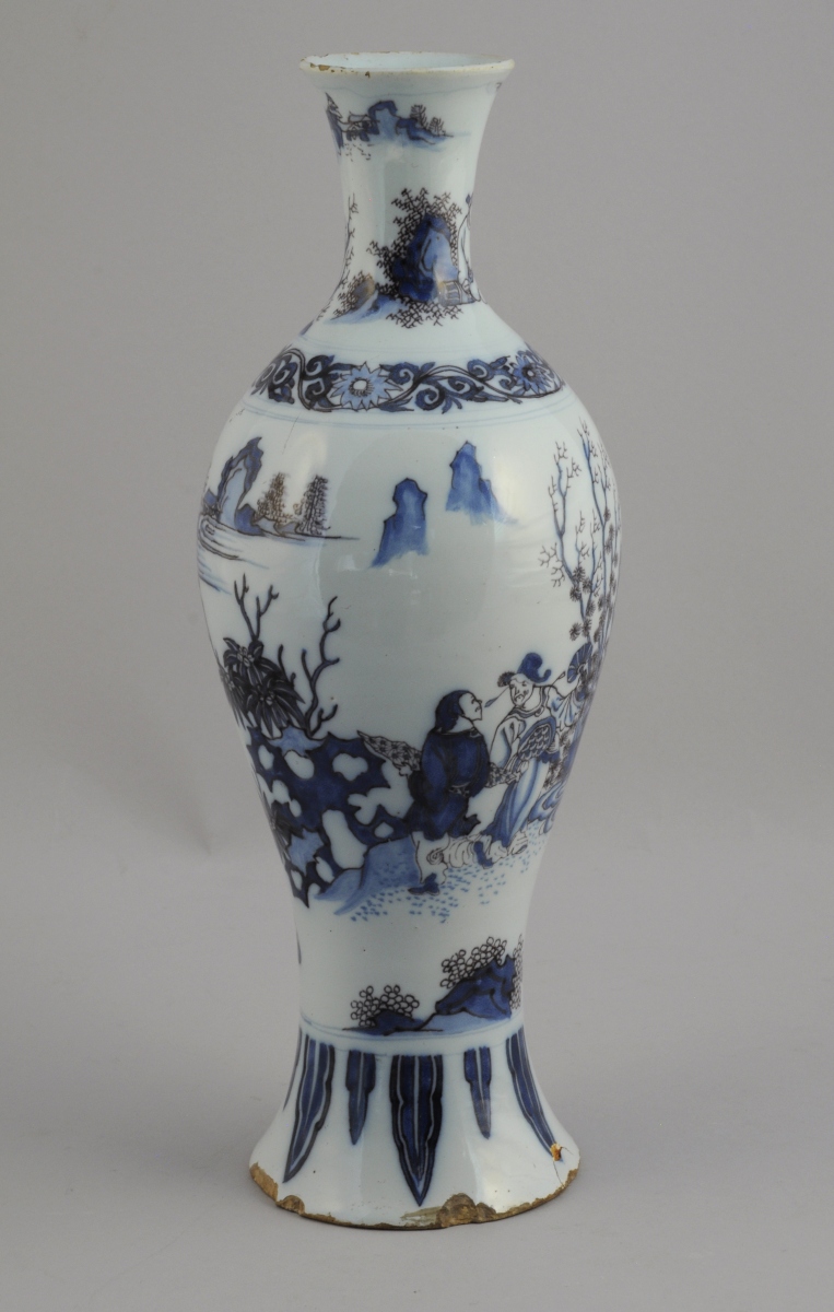 DELFT, faïence. VASE BOUTEILLE de forme balustre à fin décor en camaïeux bleu et manganèse de chinois sur fond paysager. Fin XVIIe.