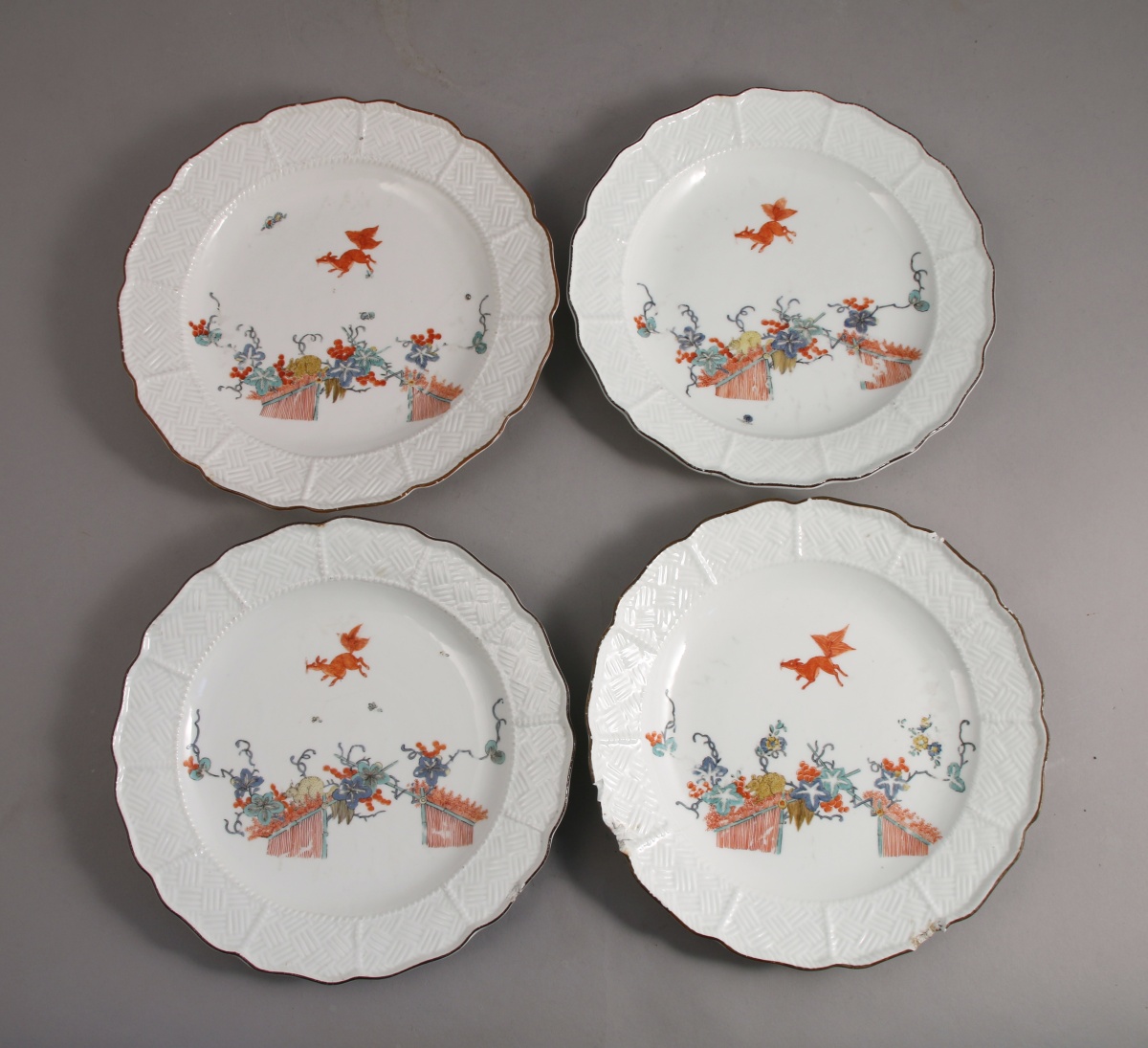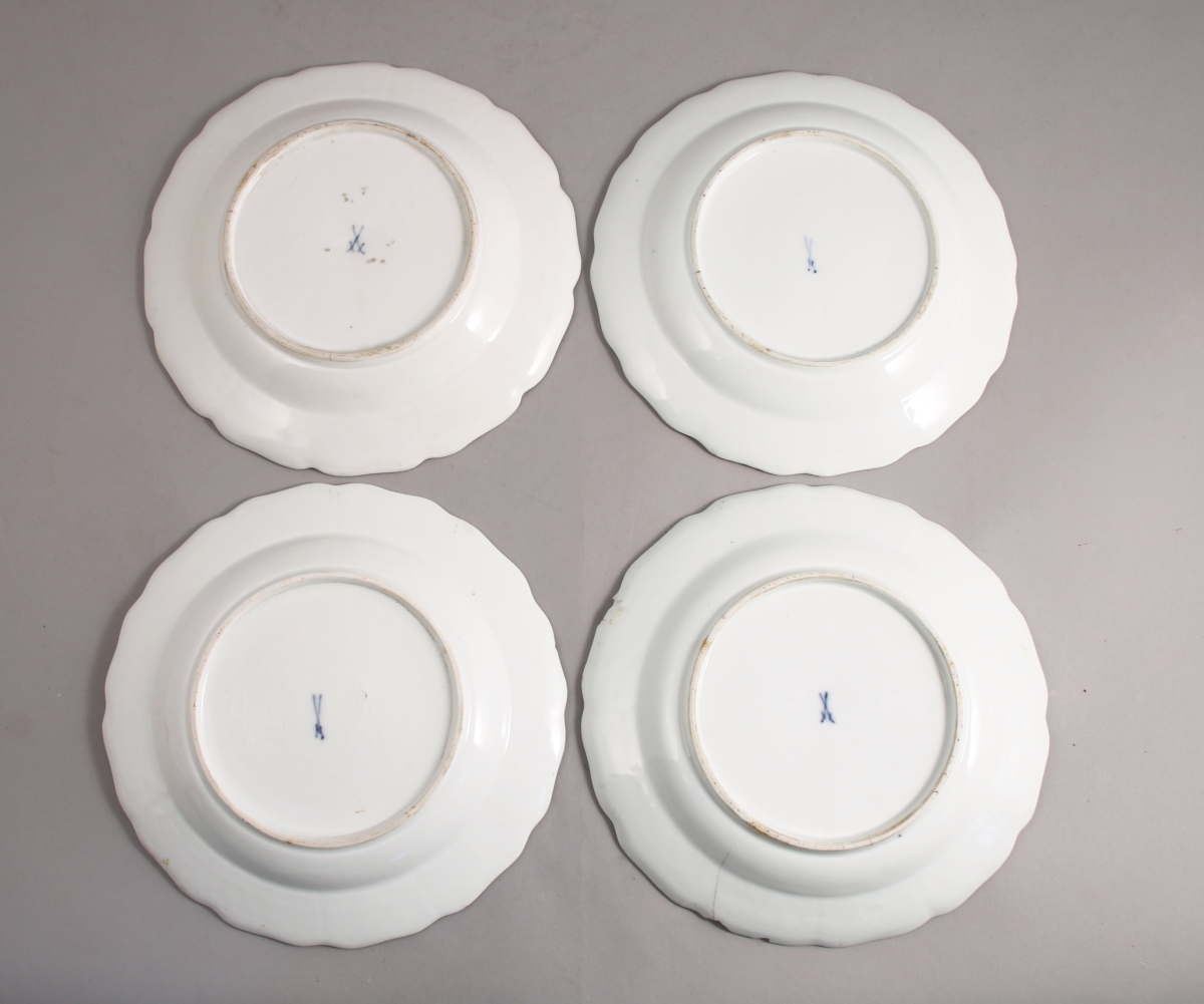 MEISSEN. Suite de 4 ASSIETTES en porcelaine, l'aile moulée de vanneries avec un décor kakiémon à la barrière fleurie animée d'un loir. Marque aux épées croisées.