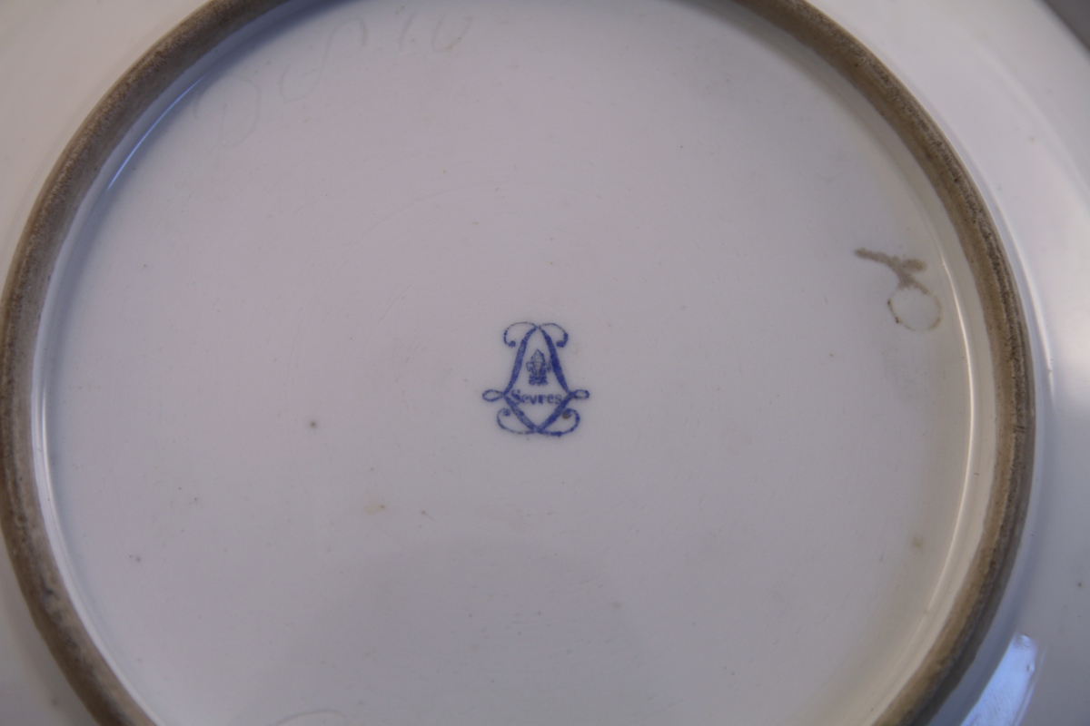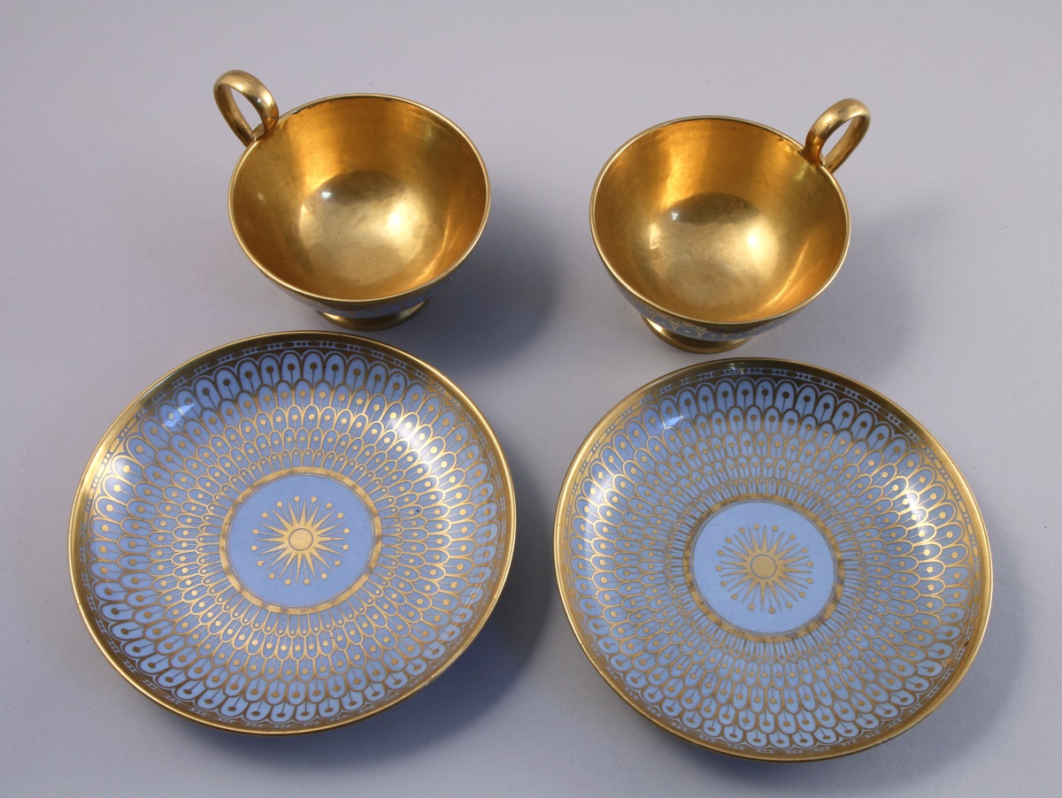 SÈVRES. Paire de TASSES de forme armillaire et leurs sous-tasses en porcelaine à fond bleu et décor à l'or stylisé. Marque en bleu au revers : "Sèvres" à fleur de lys.