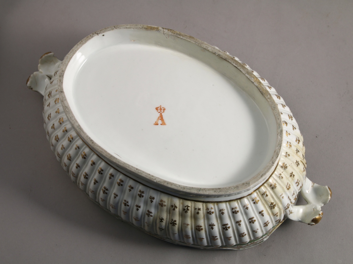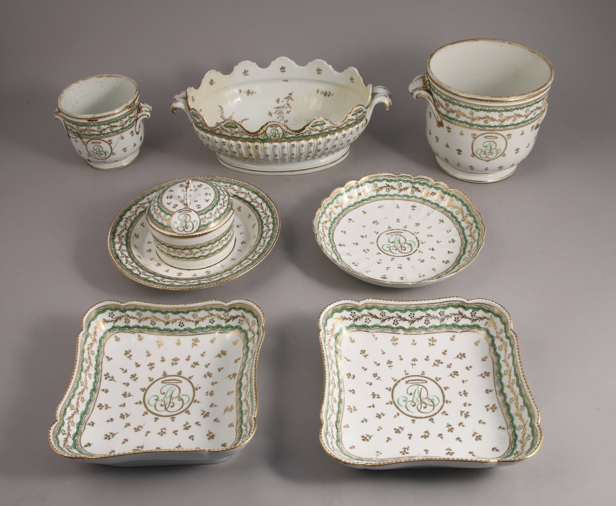 PORCELAINE À LA REINE. Partie de SERVICE, 7 pièces à décor en vert et or de frises feuillagées, semi de barbeaux et monogramme "AB". Elle se compose d'une verrière, d'un rafraîchissoir à bouteilles, d'un rafraîchissoir à verres, d'un beurrier et son dormant, d'une paire de plats creux carrés et d'un petit plat creux rond.