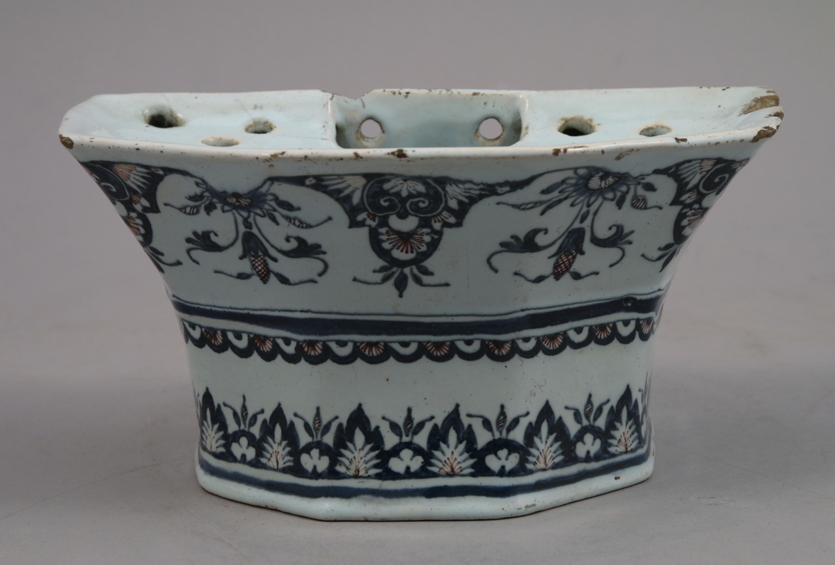 ROUEN. BOUQUETIÈRE d'applique à pans coupés en faïence de petit feu, à décor bleu et rouge de lambrequins et de fleurs.