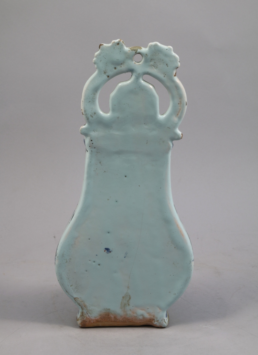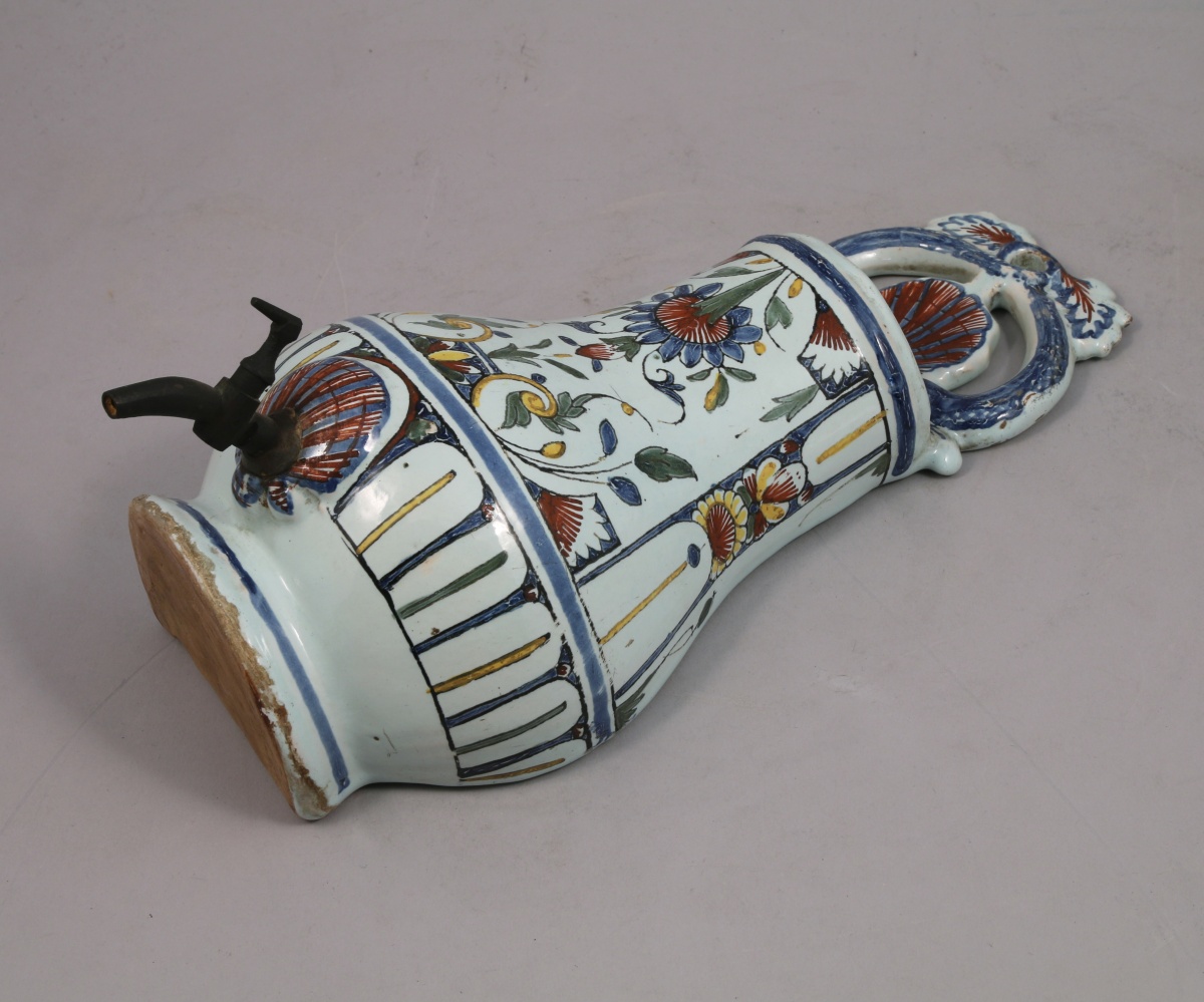 ROUEN. FONTAINE d'applique de forme balustre en faïence polychrome de petit feu, à décor de rinceaux feuillagés et fleuris. Le fronton formé de deux dauphins affrontés autour d'une coquille. Le déversoir en forme de coquille.