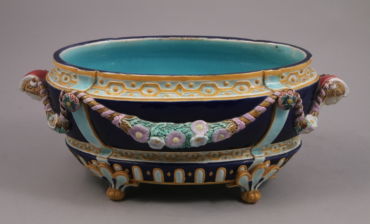 Joseph HOLDCROFT (act. 1870-1885). JARDINIÈRE de forme oblongue en barbotine polychrome. La panse à fond cobalt, ornée de guirlandes de fleurs retenues par des boutons de fleurs et des têtes de femmes formant prises. La jardinière repose sur quatre pieds griffes à palmettes. Marque "J.HOLDCROFT" en creux au revers.