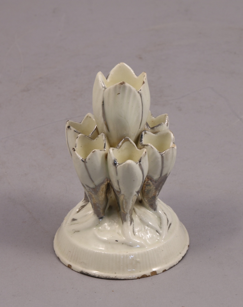 LANGEAIS. PIQUE-FLEURS de forme circulaire à sept bulbes à l'imitation de fleurs, en faïence fine à fond blanc crémeux. Décor à réhaut de platine.