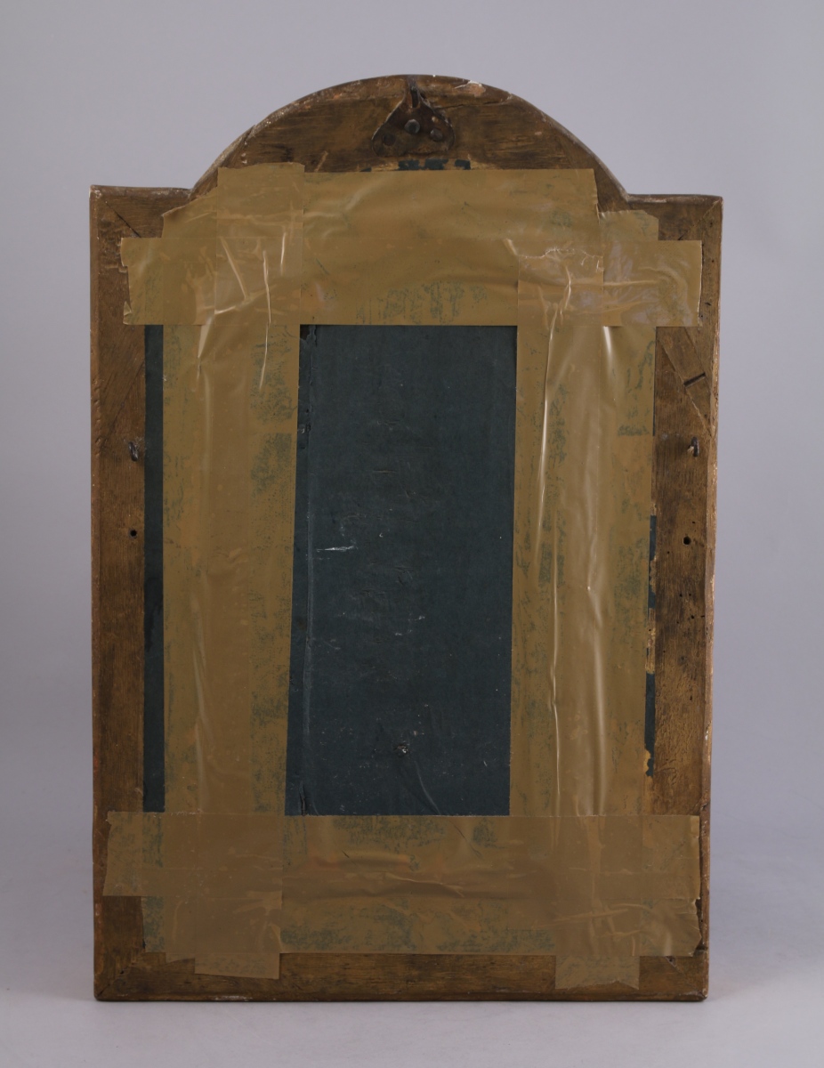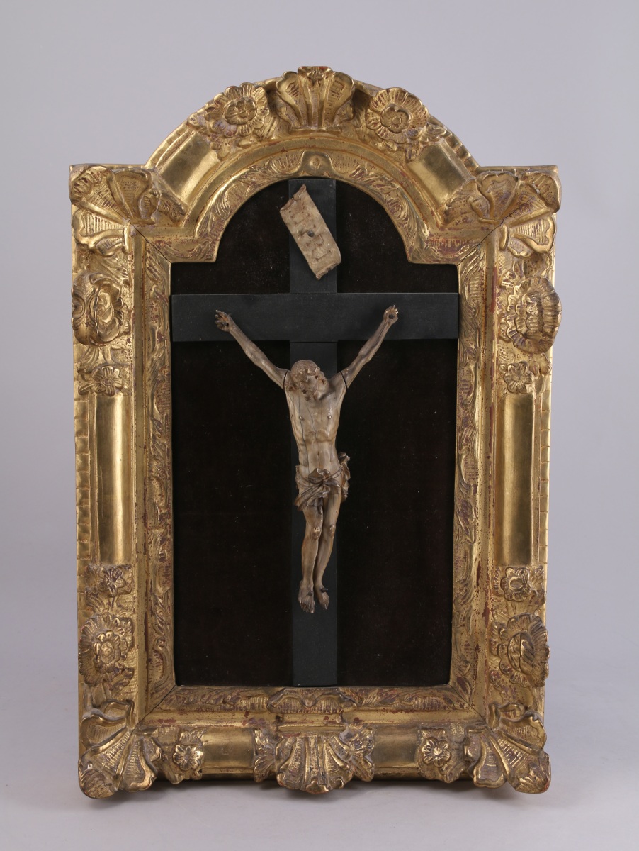 CRUCIFIX et phylactère marqué "INRI" en albâtre ?. Croix en bois noirci. Dans un cadre en bois sculpté et doré richement orné de rinceaux, feuilles d'acanthe, palmettes et roses.