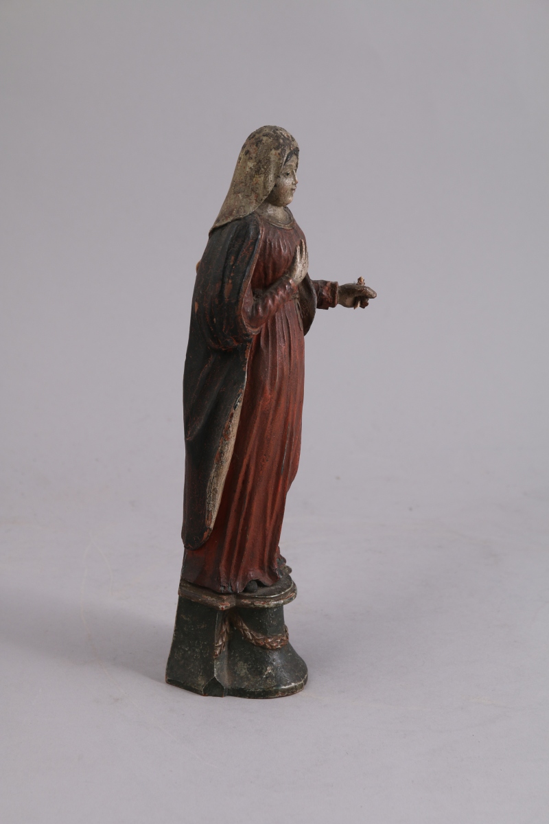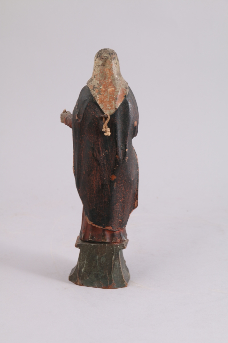 SAINTE PÉNITENTE en bois polychrome, la sainte Vierge pénitente tenant une fleur debout sur un piédestal à décor d'un tore de laurier.