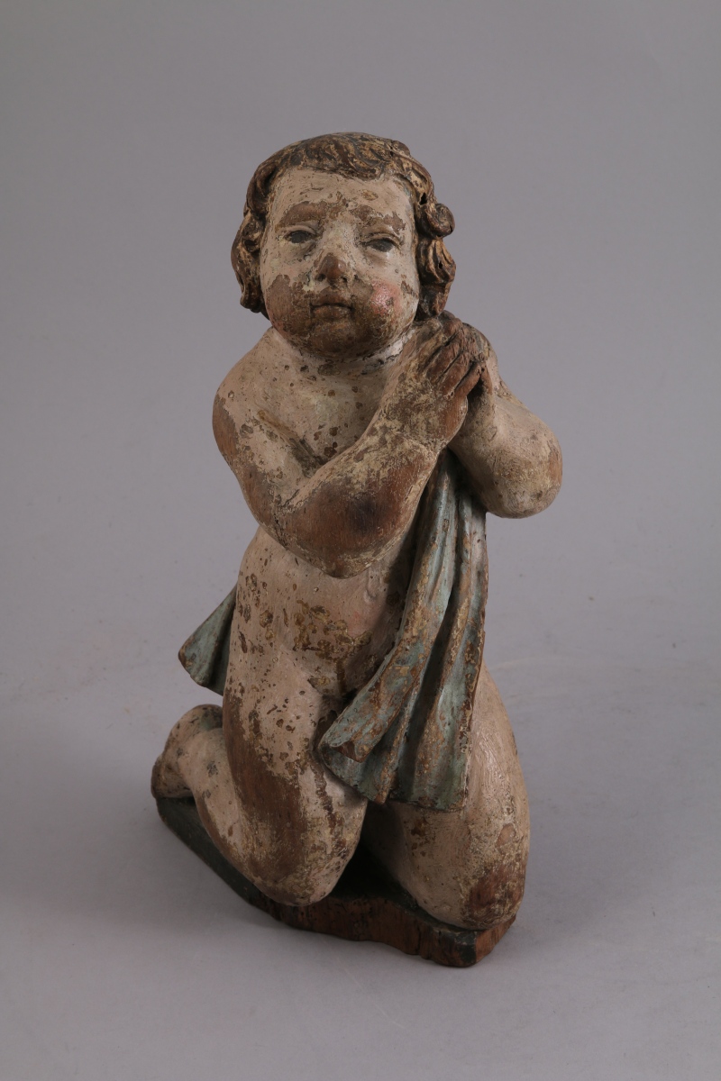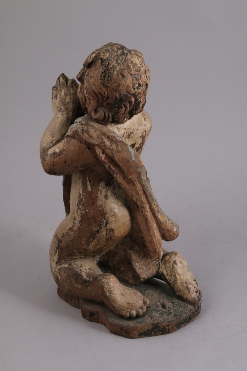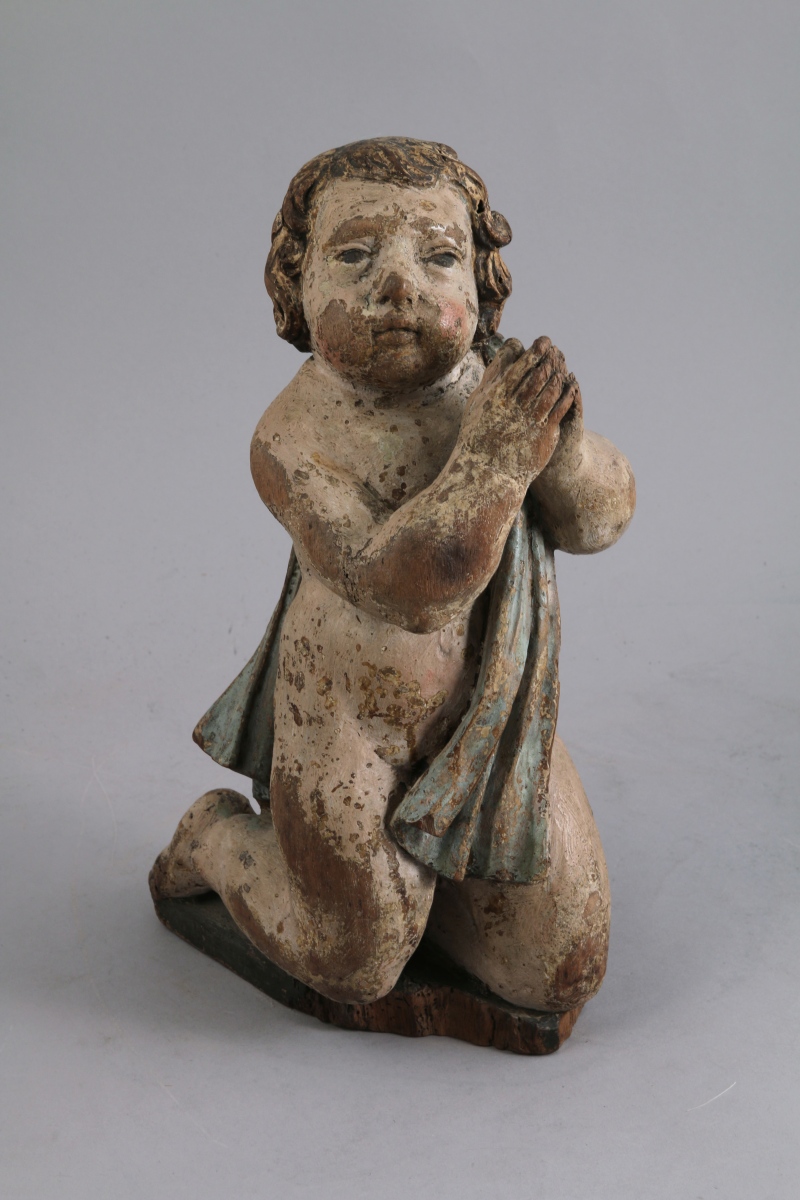 ANGELOT en bois sculpté polychrome. L'angelot drapé, priant les mains jointes à genoux.