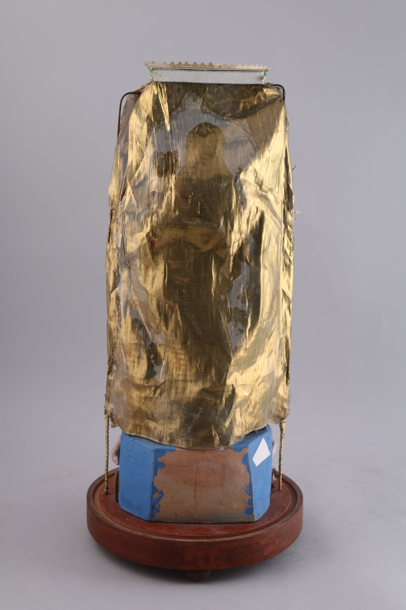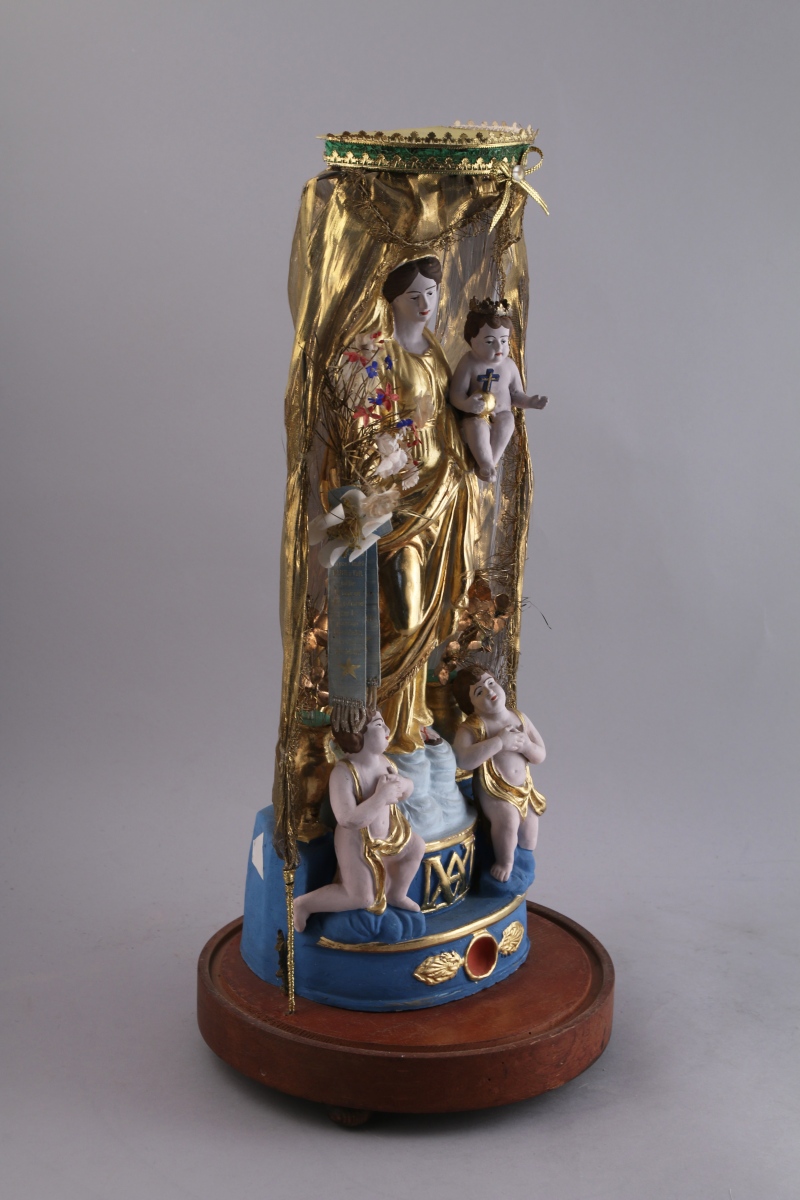 VIERGE A L'ENFANT en terre cuite polychrome. La sainte Vierge drapée d'or porte sur son bras gauche le Christ couronné tenant l'orbe, dans sa main droite un bouquet fleuri en tissu et une prière "En souvenir de Lourdes". Marie debout sur un nuage, flanquée de deux vases fleuris, adorée par deux angelots drapés. Le groupe sous un dais repose sur une base étagée au monogramme marial, le socle en bois à quatre pieds sous son globe en verre.