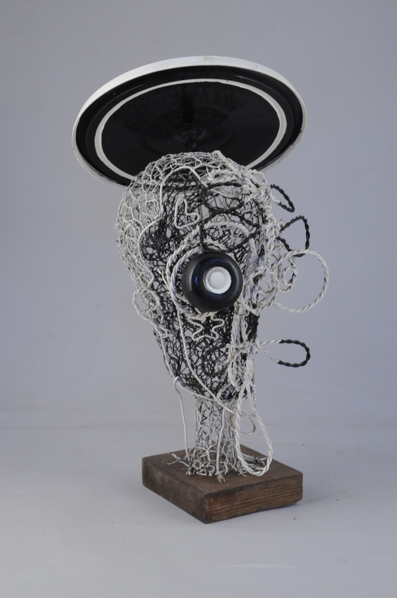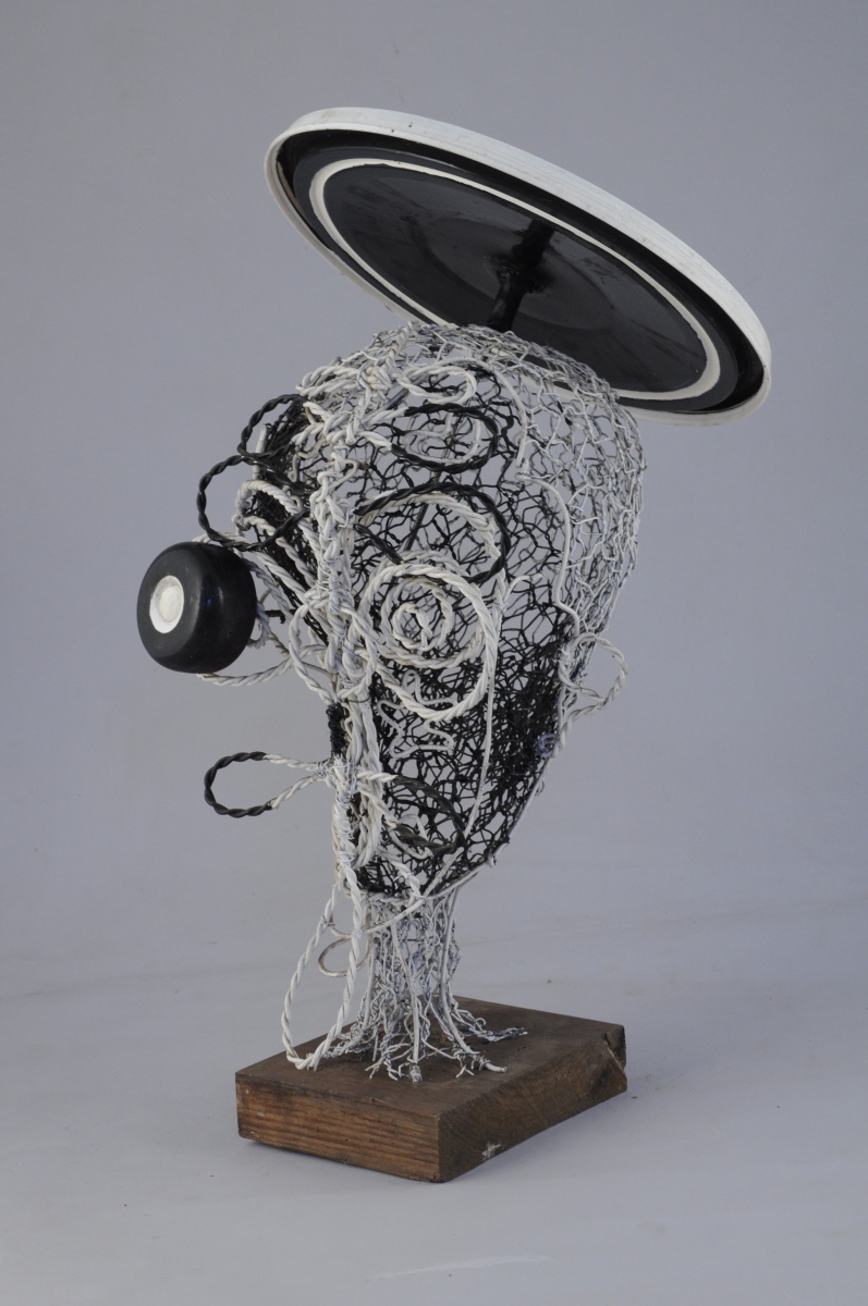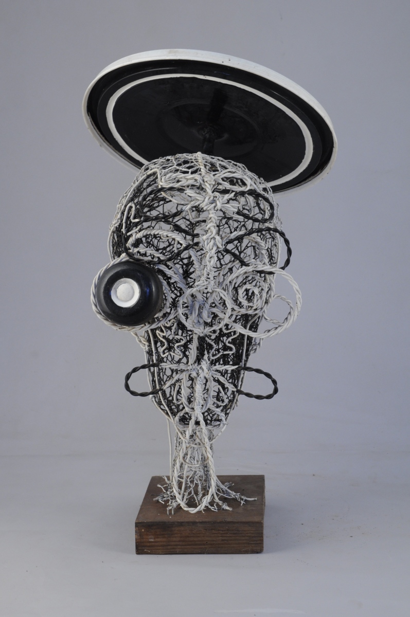 Sculpture en grillage peint et plastique sur socle de bois, deux éléments.
