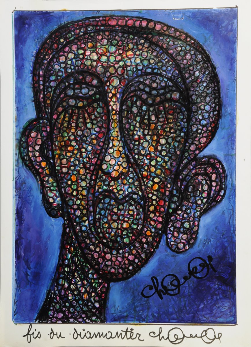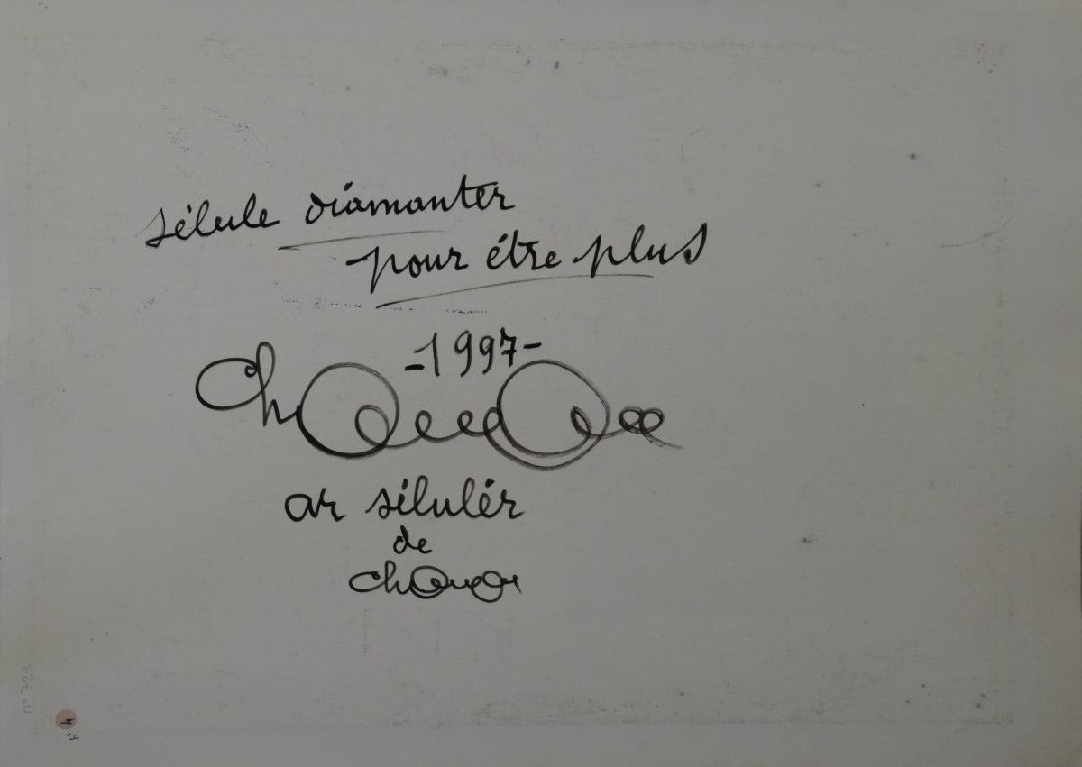 Encrine signée. Contresignée et titrée sur le montage. Contresignée deux fois, datée 1997 et marquée "sélule diamanter pour ètre plus / ar sélulèr de Chomo" au dos.