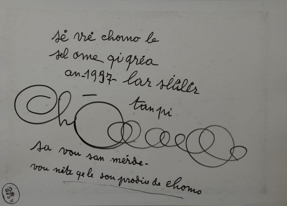 Encrine signée. Contresignée et titrée sur le montage. Contresignée, datée 1997 et marquée "sé vré chomo le sel ome qi qréa an -1997- lar sélulèr - tan pi / sa vou san mèrde- vou nète qe le sou produi de chomo" au dos.