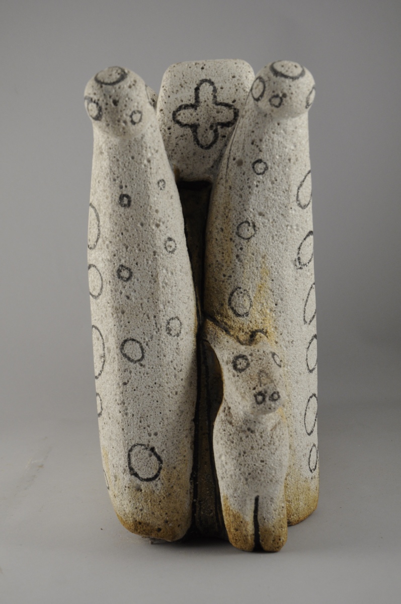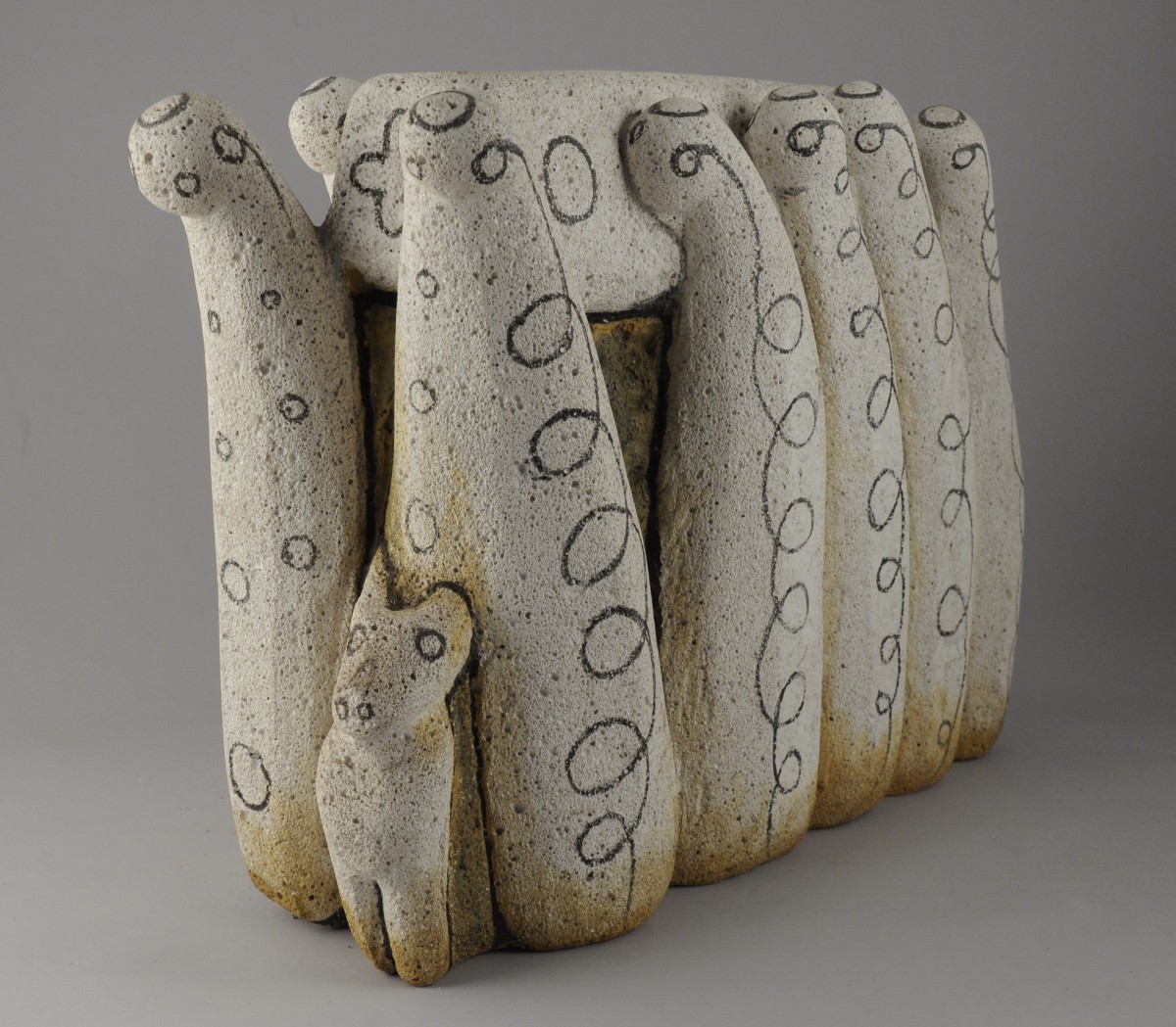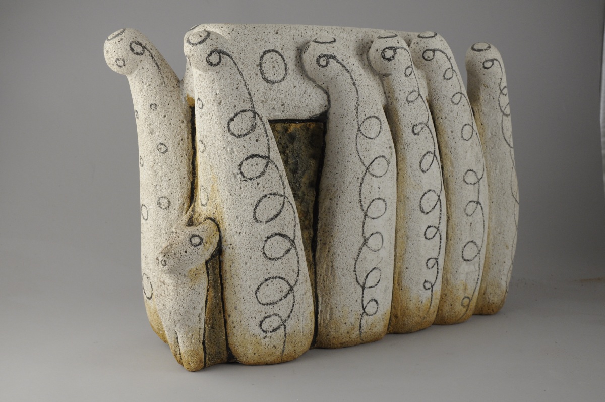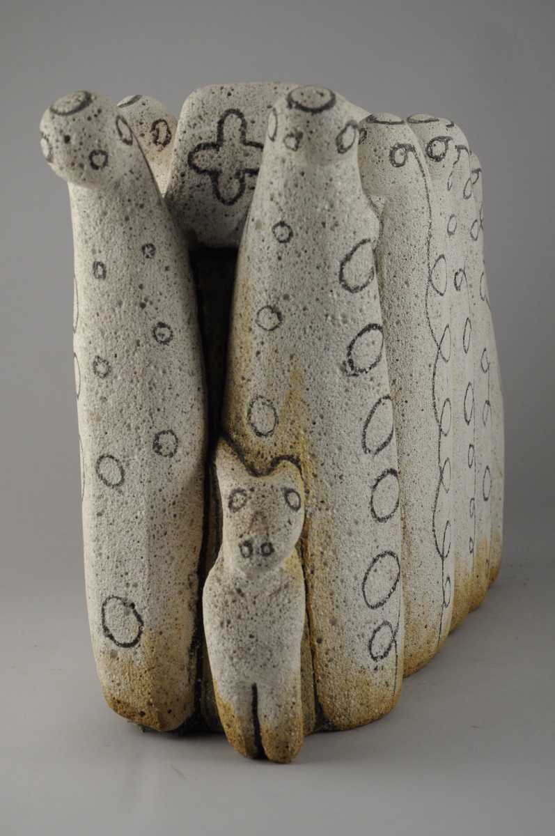 Sculpture en siporex blanc historié, dix personnages portant un cerceuil précédés d'un chien, signé sur le cerceuil.