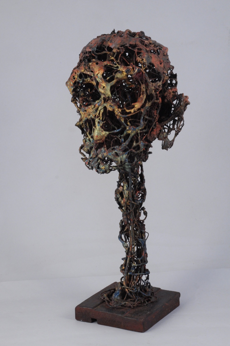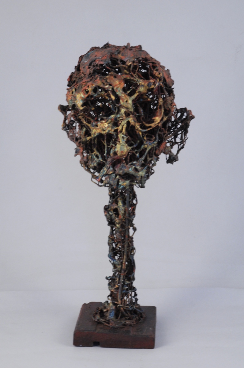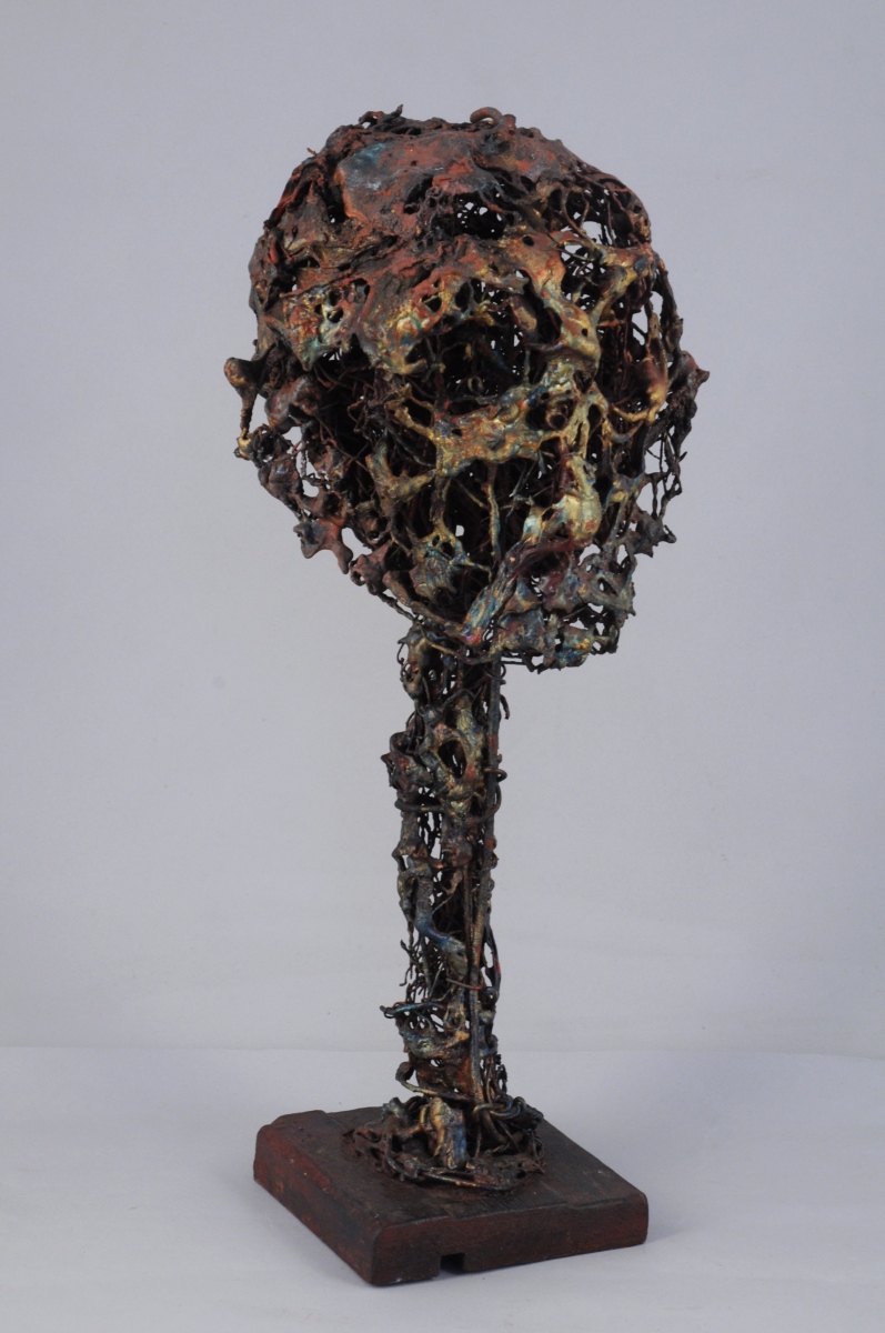 Sculpture en grillage, plastique fondu et incrusté, signé sur socle de bois.