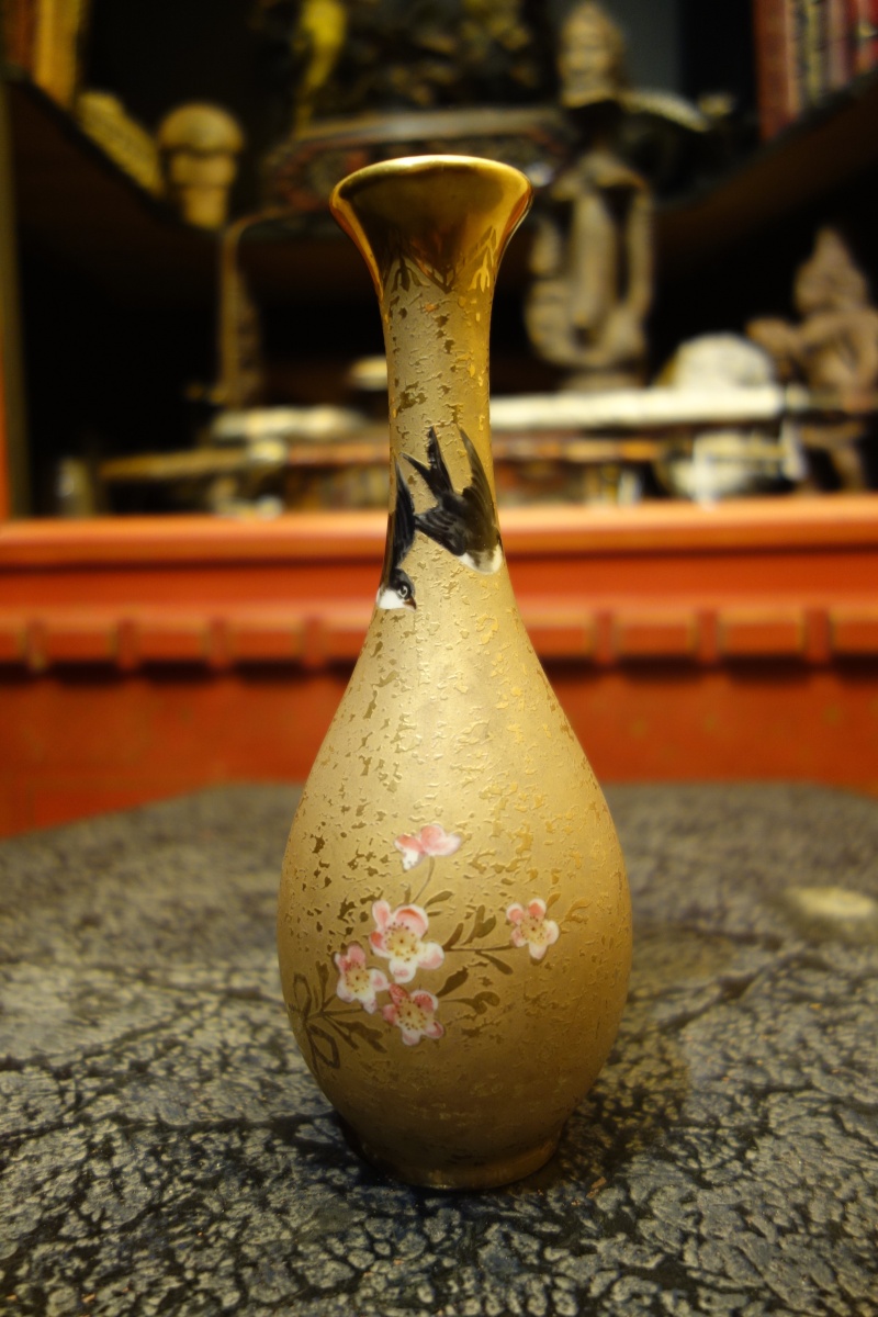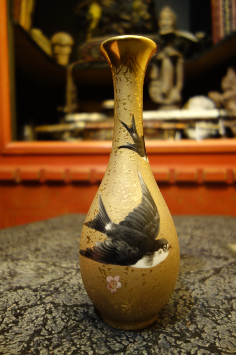HISTOIRE NATURELLE. LIMOGES.VASE aux HIRONDELLES en porcelaine. Signé dans un cachet rond " JC " sous la base.