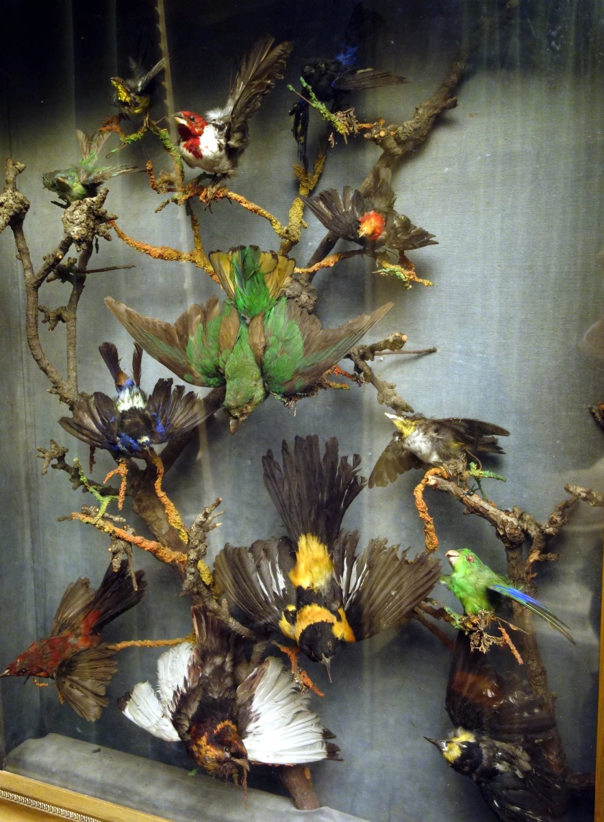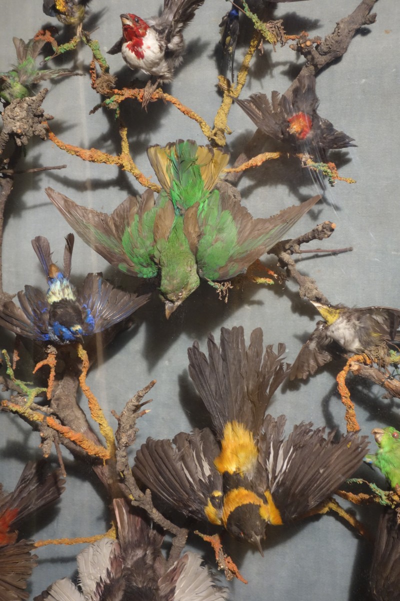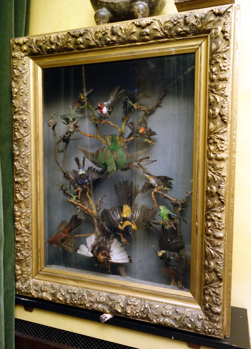 HISTOIRE NATURELLE. GRAND CADRE en bois stuqué et doré réunissant environ treize oiseaux dans une vitrine.