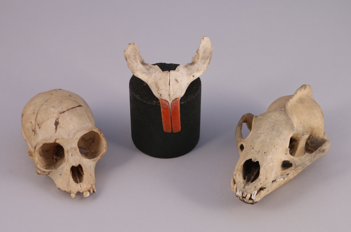 JOINT : CRÂNE de SINGE, CRÂNE de BLAIREAU, INCISIVES de RAGONDIN sur un socle