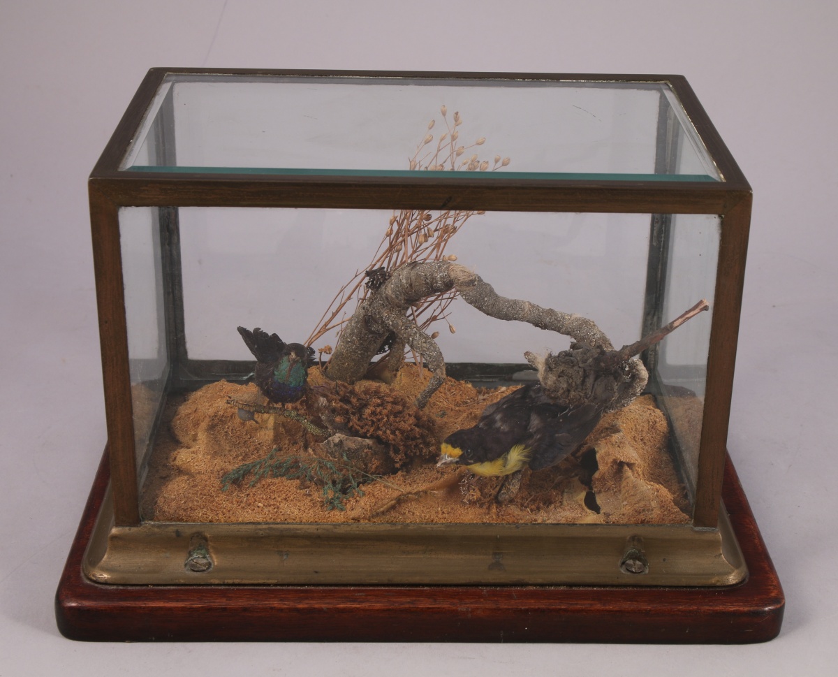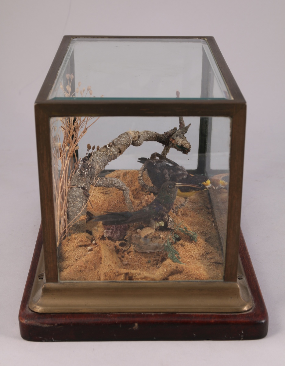 HISTOIRE NATURELLE. DEUX OISEAUX naturalisés dont un colibri, dans un diorama. Présentés dans une boîte vitrée, au bord biseauté dans la partie supérieure.