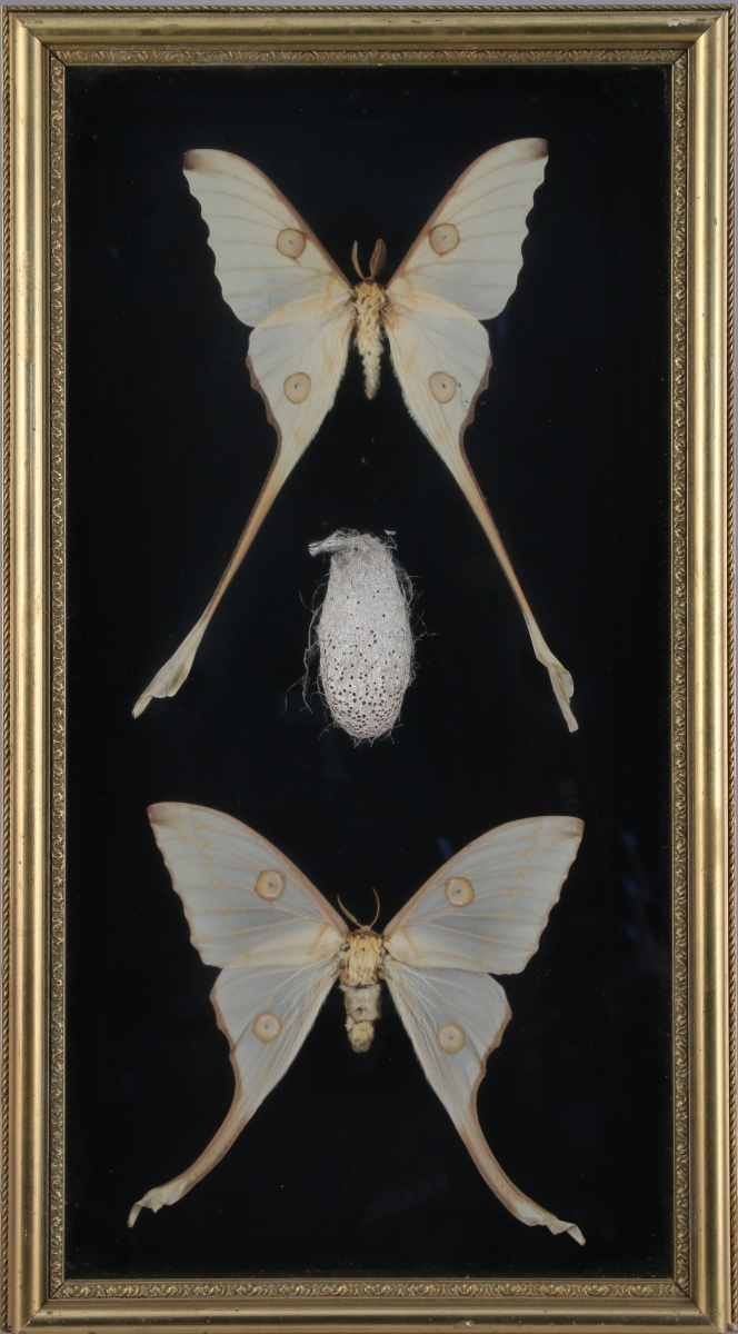 HISTOIRE NATURELLE. DEUX ACTIAS COMETES de Madagascar et un COCON. Encadré sous verre.
