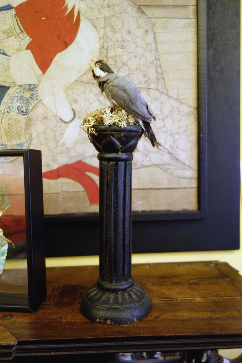 JOINT : PHASME PHYLLIUM GIGANTEUM (Malaisie) dans son cadre (12 cm), OISEAU naturalisé branché sur une colonne (30 cm).