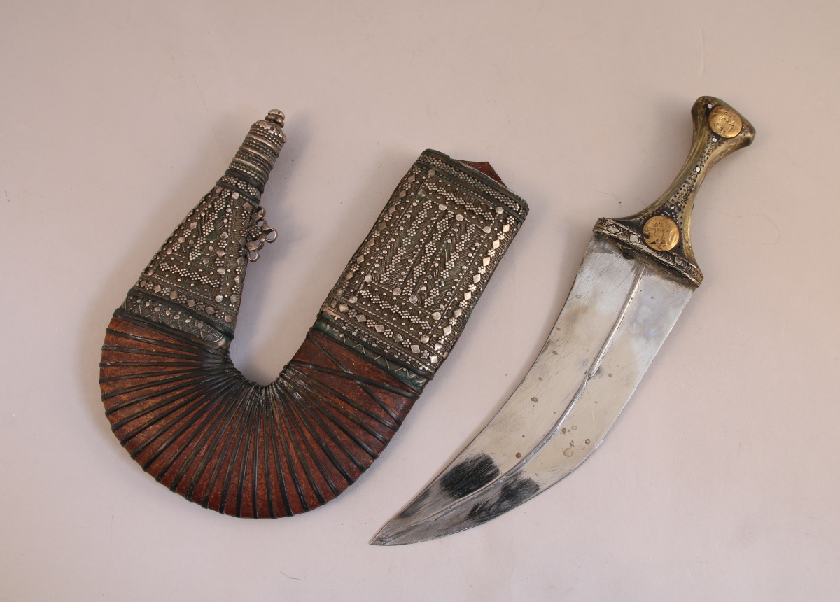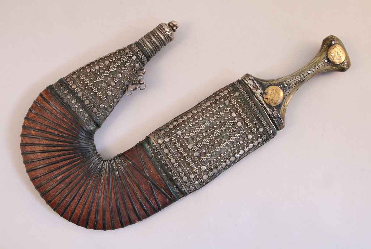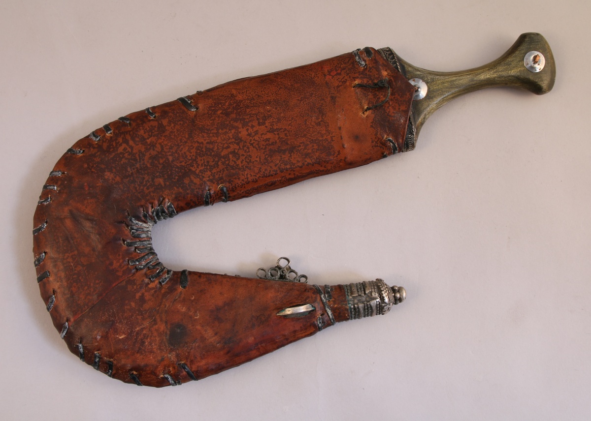 YÉMEN. POIGNARD DJAMBIYA à lame courbe, le fourreau en cuir à décor fleuri en métal argenté.