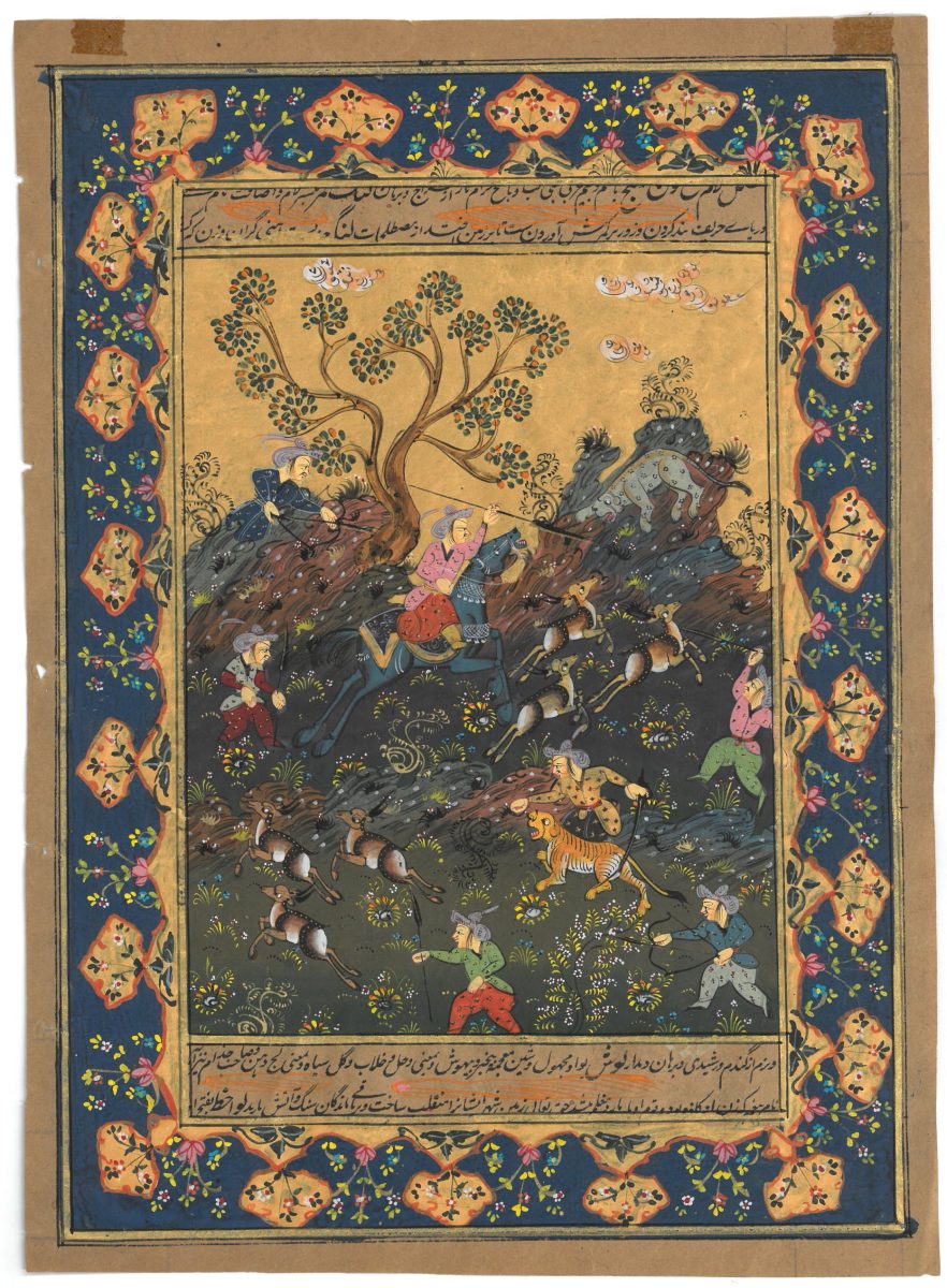 CACHEMIRE - XXe. PAGE de MANUSCRIT illustrée d'une scène de chasse au tigre sur fond or.