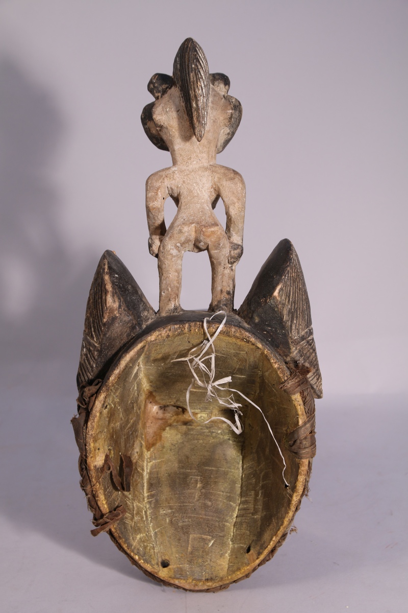 AFRIQUE. MASQUE en bois sculpté et peint sommé d'un petit personnage.