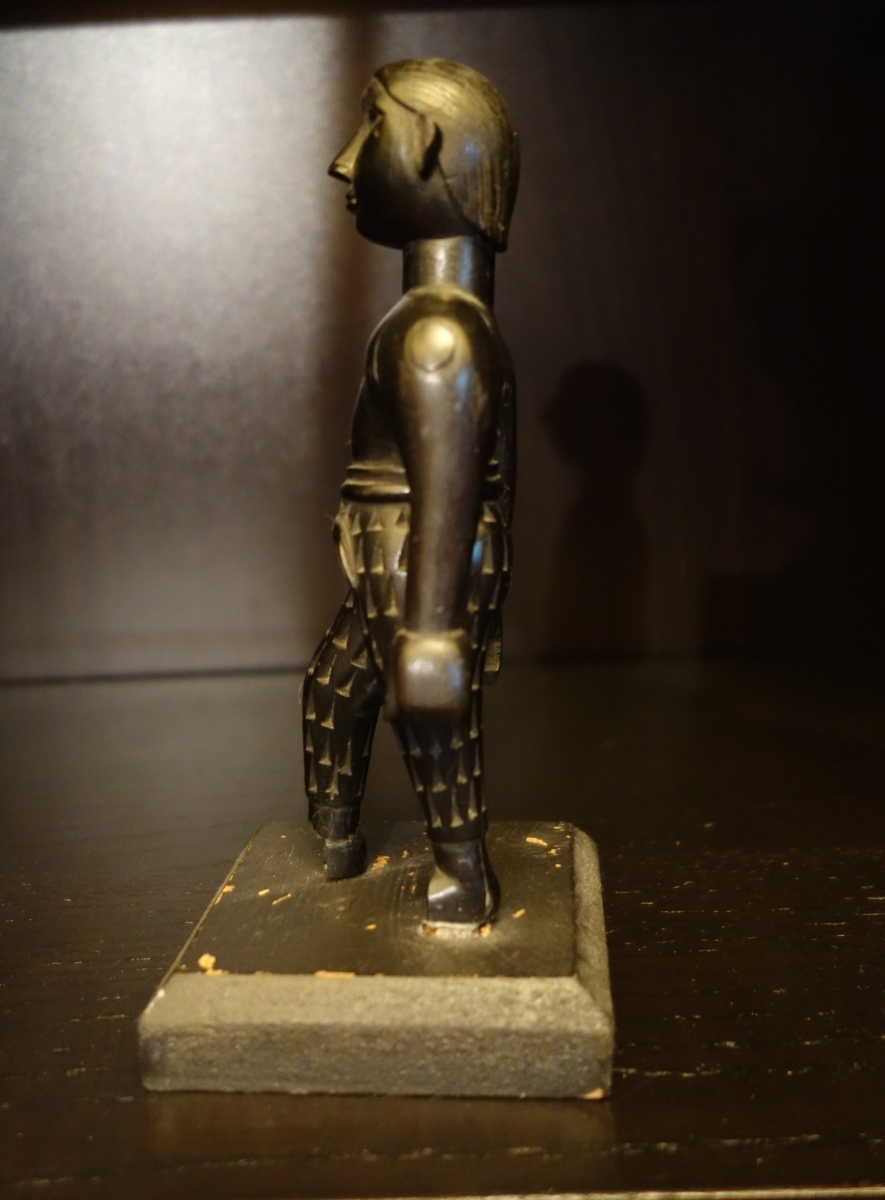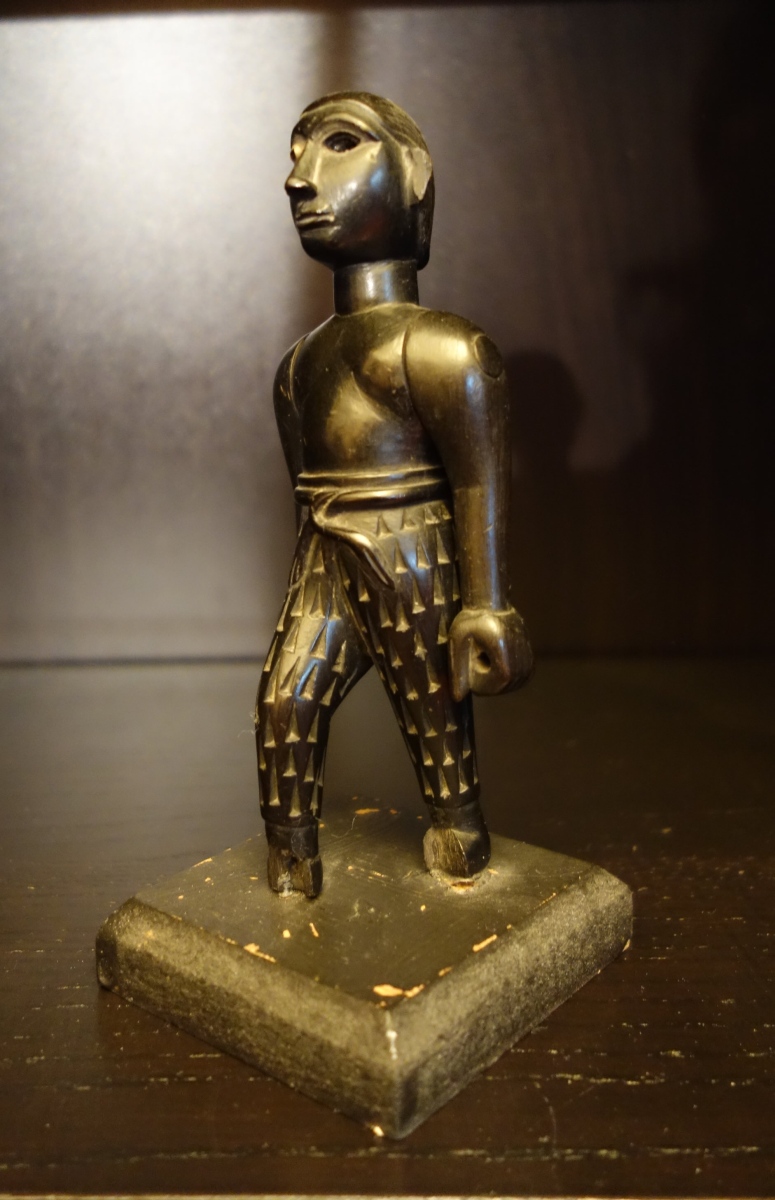 AFRIQUE. PERSONNAGE articulé en ébène dans la position de la marche, il droit en pierre blanche. Sur son socle.