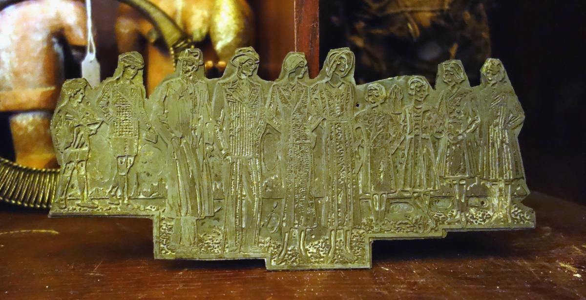 JOINT : PLAQUE en étain figurant dix personnages pour le décor de meubles. Vers 1920. Long. 28 cm.