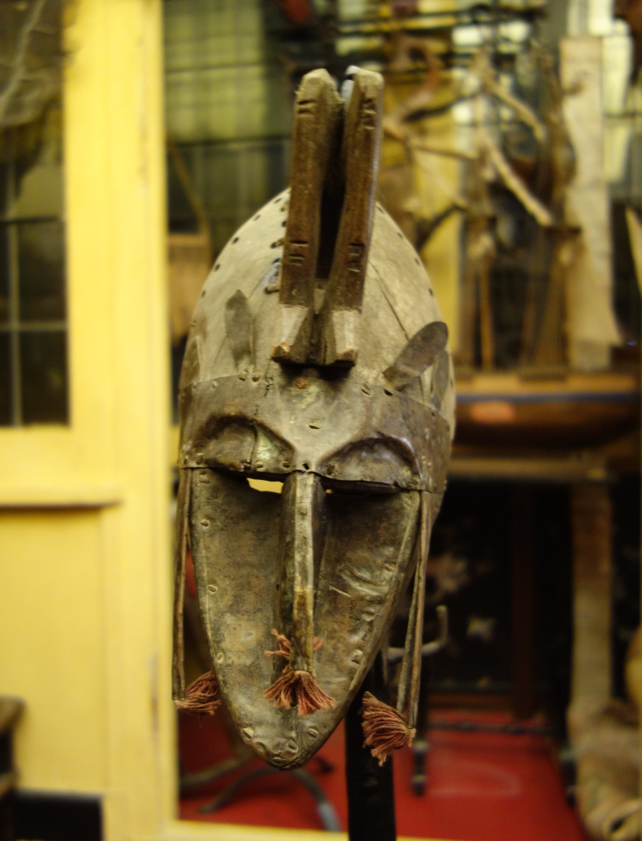 AFRIQUE. MASQUE en bois, cuivre, fibres.